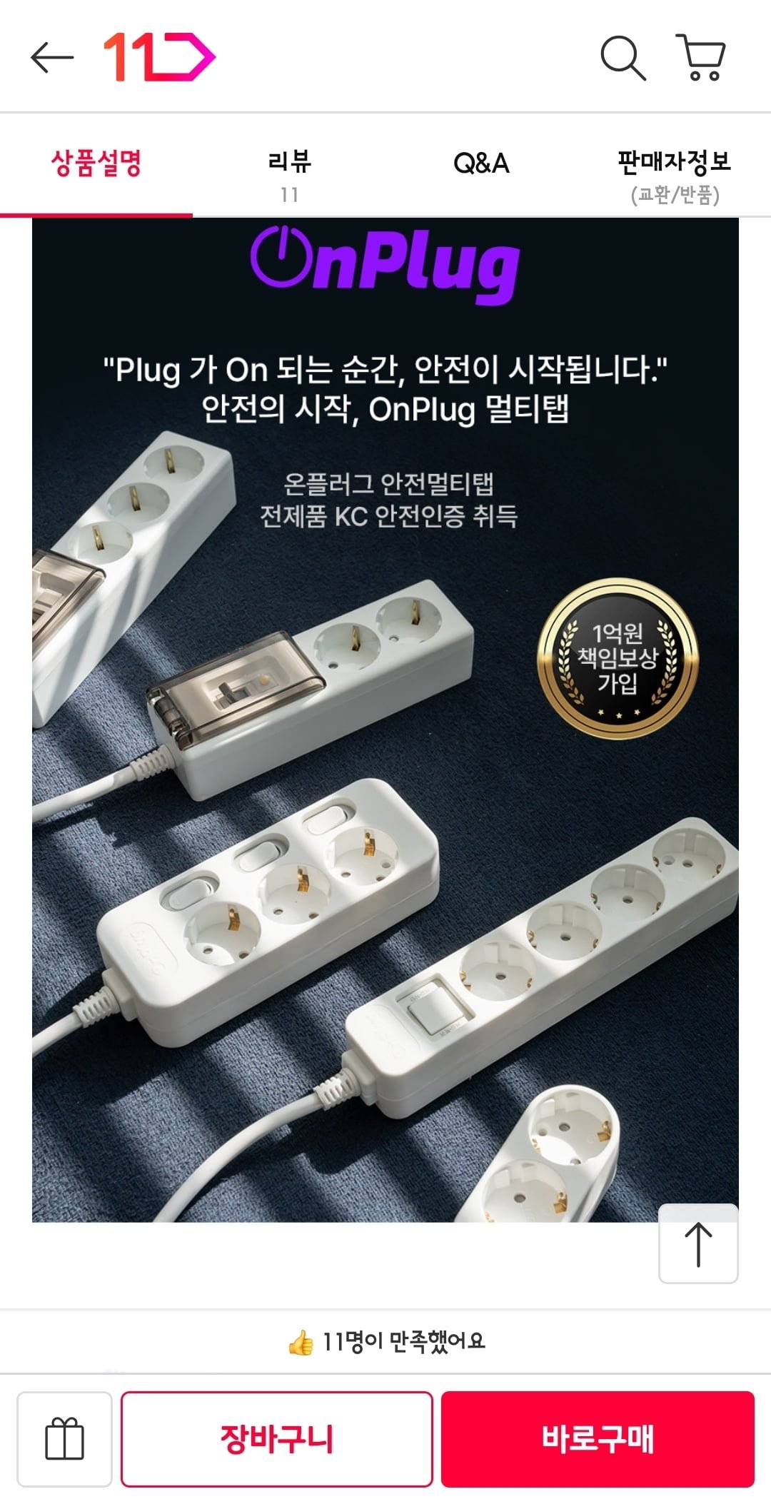 [11번가]국내KC인증 과부하차단 멀티탭1+1(8,900원/무배)