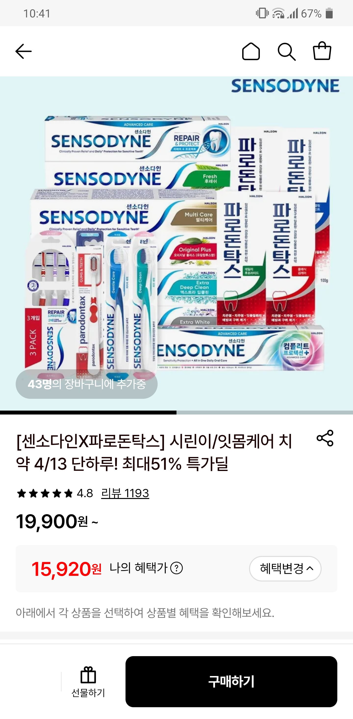 [롯데온]센소다인 오리지널 플러스100g 6개 (15,920원/무료)