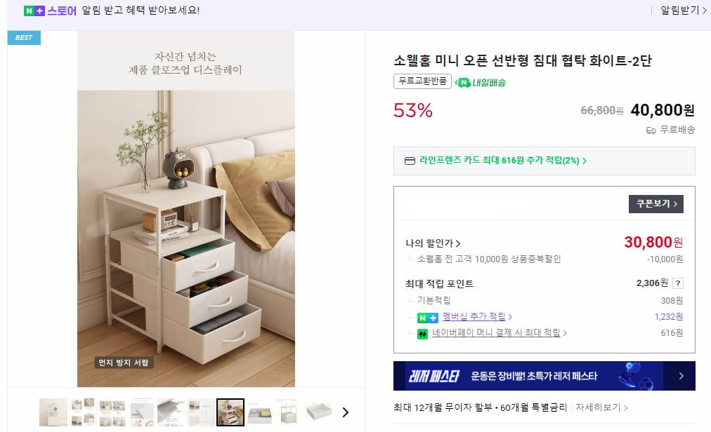[네이버]소웰홈 미니 오픈 선반형 침대 협탁 화이트 2단 (30,800원/무료)