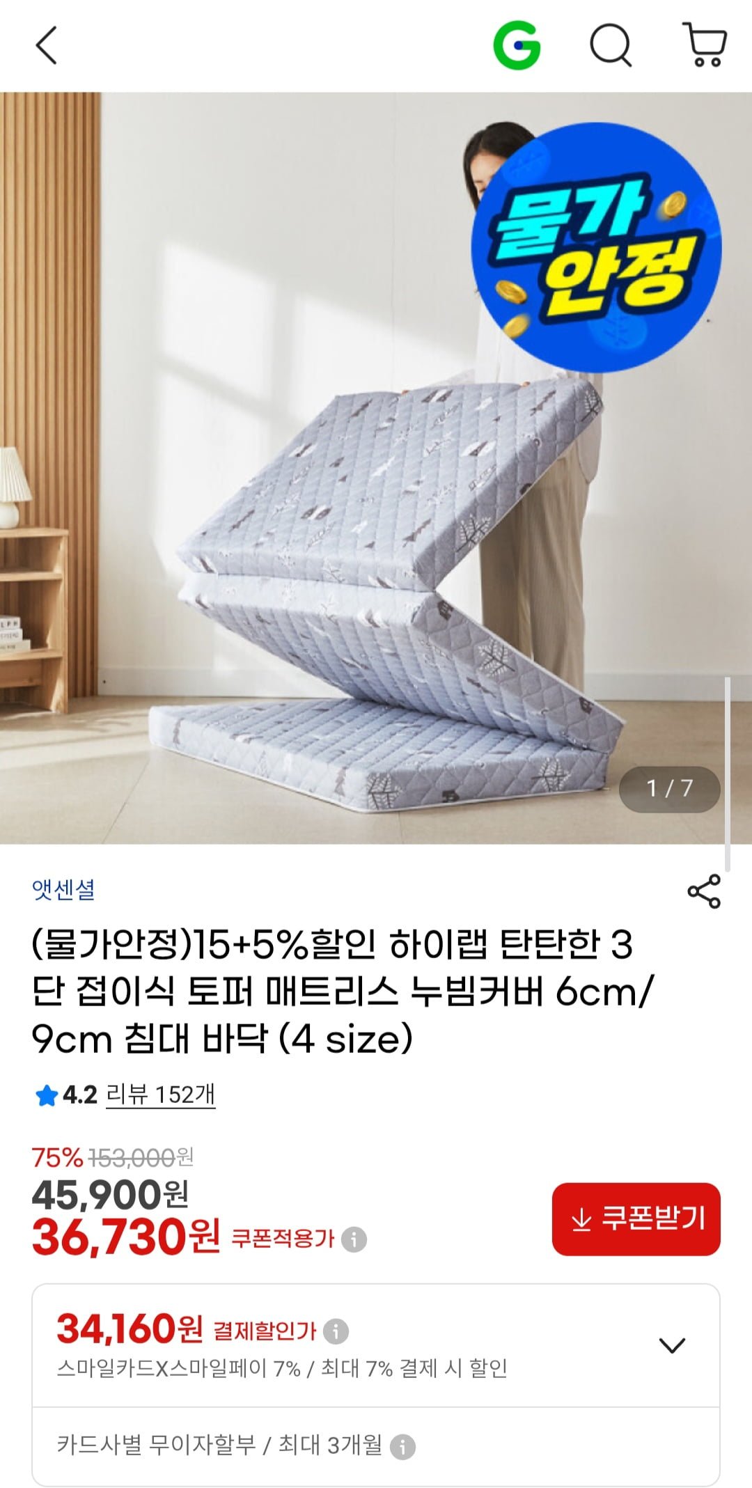 [G마켓]하이랩 3단 접이식 토퍼 매트리스 누빔커버 6cm/9cm (36,730원~/무배)