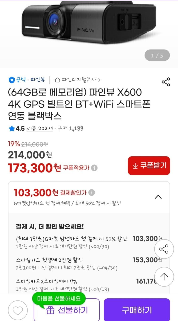 [지마켓]파인뷰 블랙박스 X600 4K GPS 빌트인 BT+WiFi (카드 161,170원/무료)