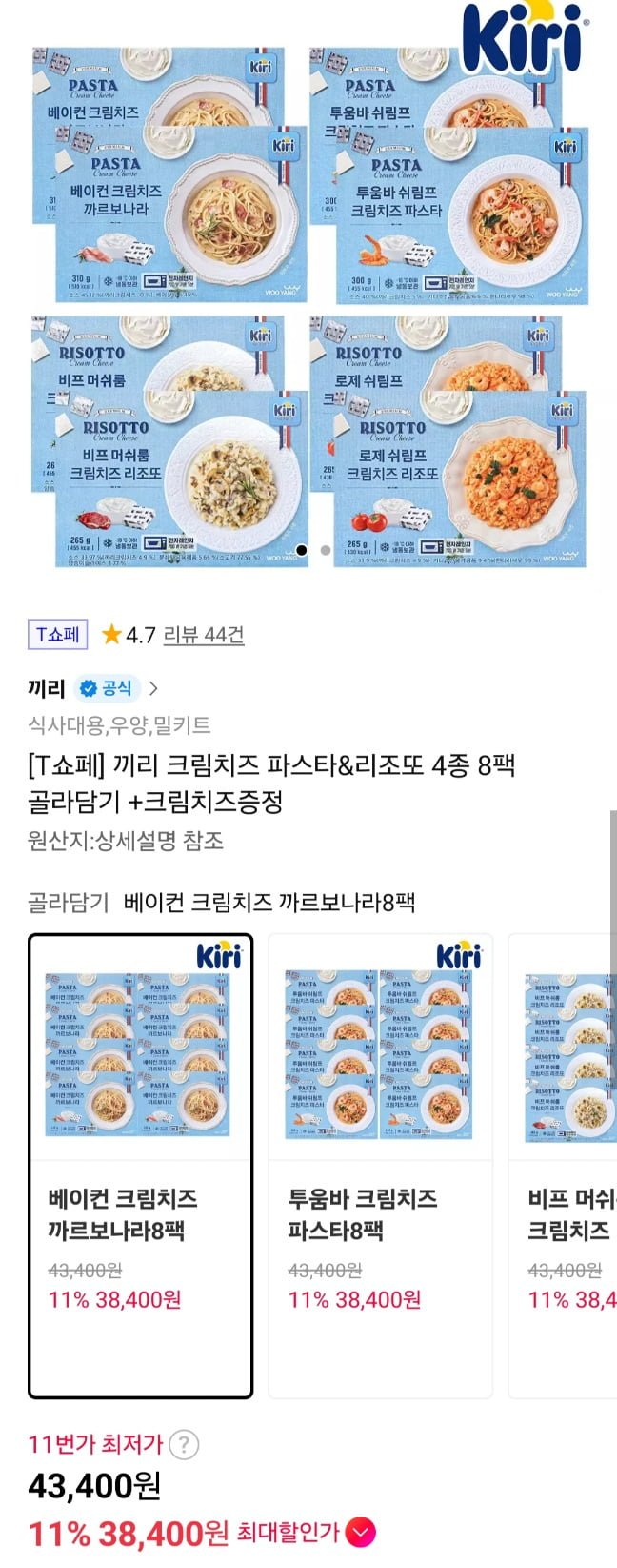 [11번가]티멤 끼리 크림치즈 파스타앤리조또 4종 8팩+증정(38,400원/무료) - 딜모아