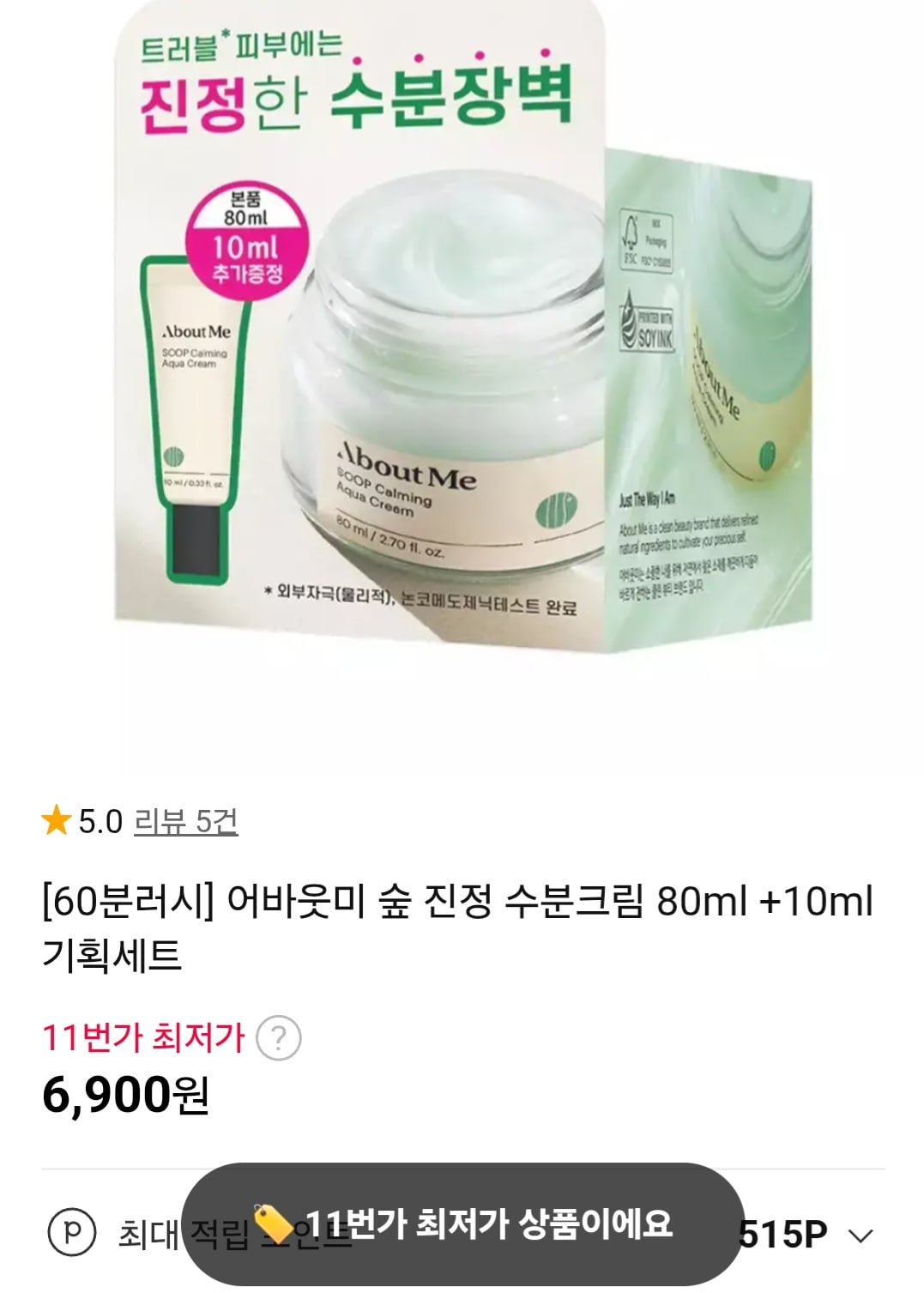 [11번가]어바웃미 숲 진정 수분크림 80ML+10ML (6,900원/무료)