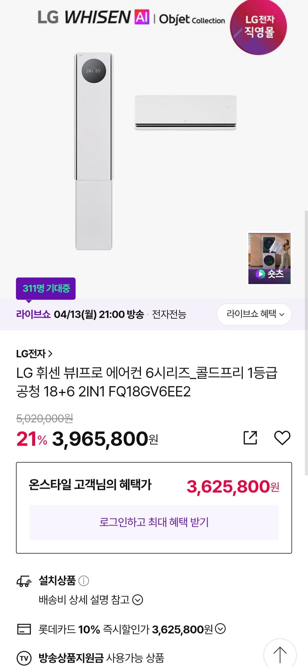 [CJ온스타일]LG 휘센 뷰I프로 에어컨 2IN1 FQ18GV6EE2 (롯데카드 3,625,800원/무료)