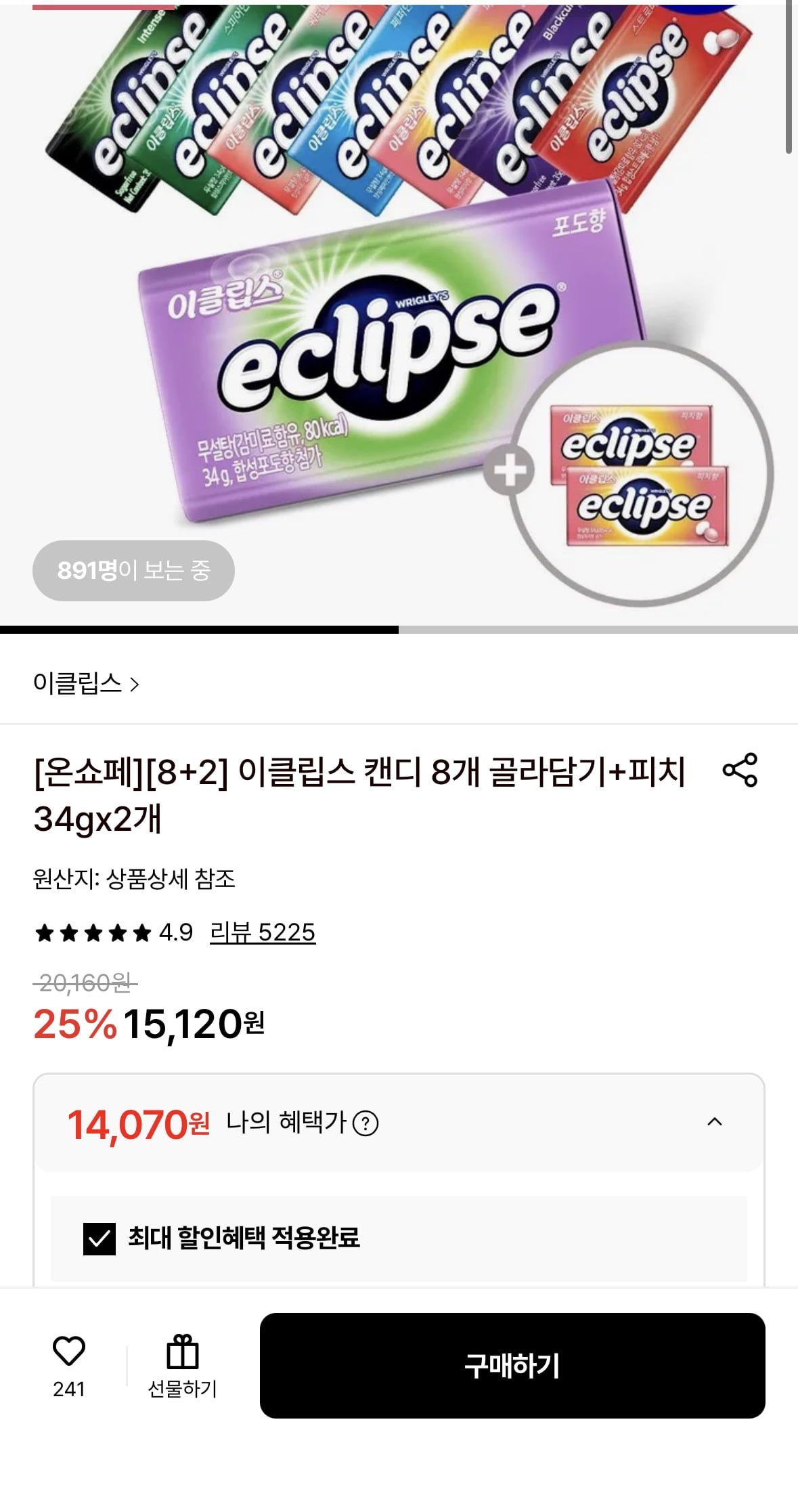 [롯데온]이클립스 캔디 8개 골라담기+피치34gx2개(카드 14,070원/무배)