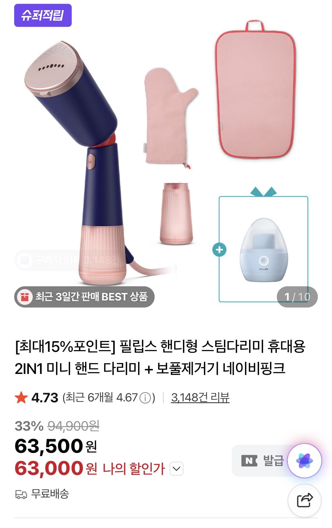 [네이버]필립스 핸디형 스팀다리미 2IN1 + 보풀제거기 파우치 장갑 세트 (63,000원/무료)