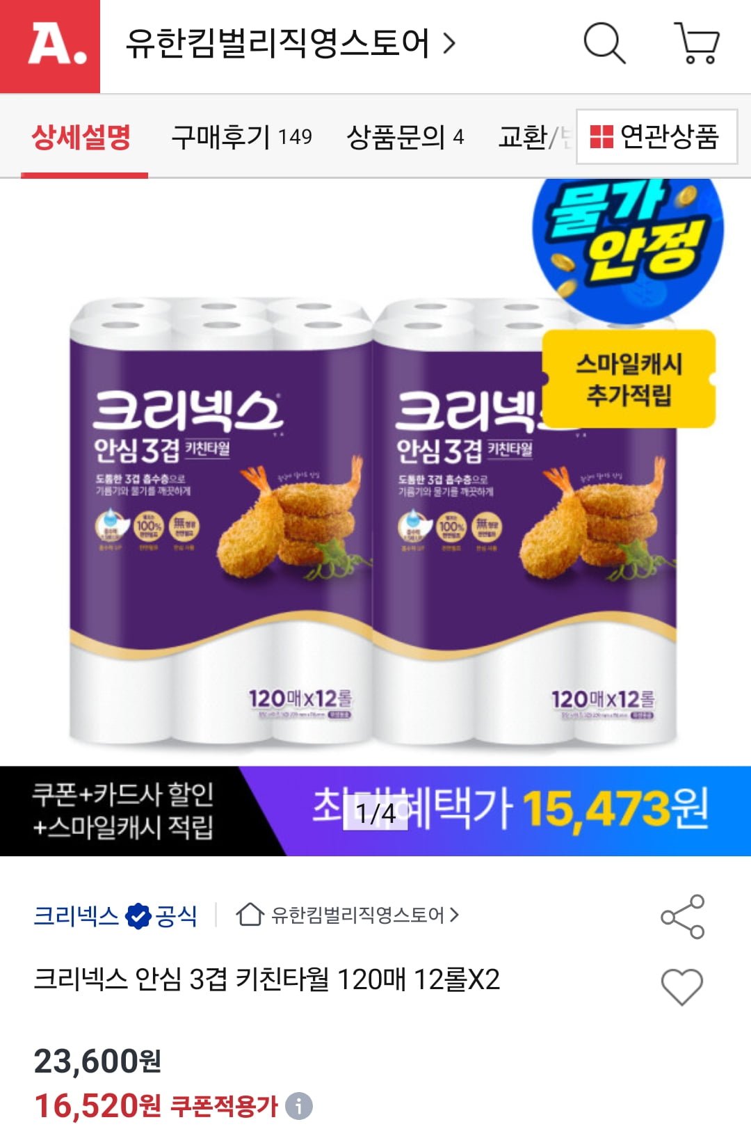 [옥션]크리넥스 안심 3겹 키친타월 120매 24롤(15,360원/무배)