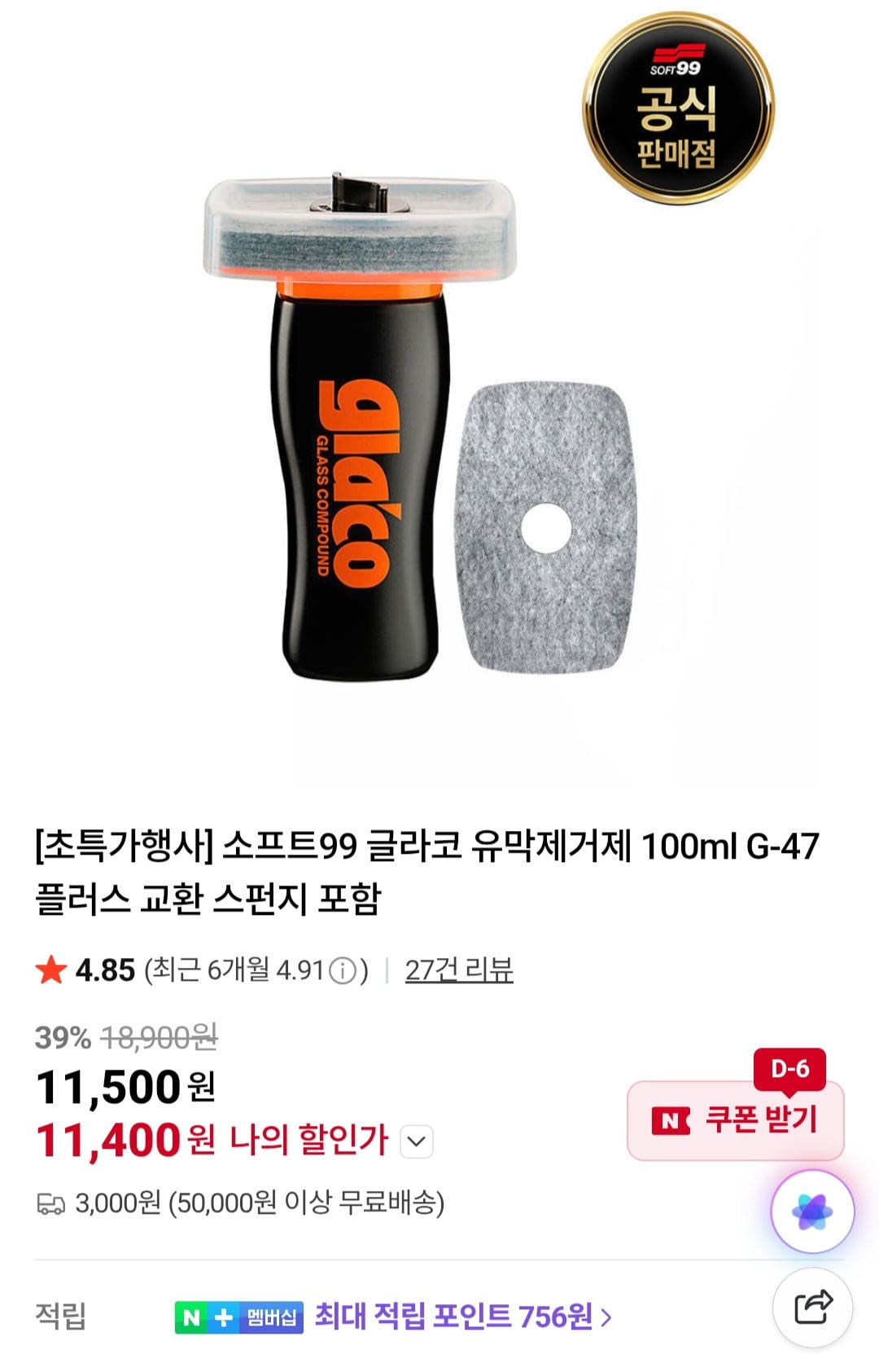 [네이버]소프트99 글라코 유막제거제 100ml G-47 플러스 + 교환 스펀지 (11,400원/유배)