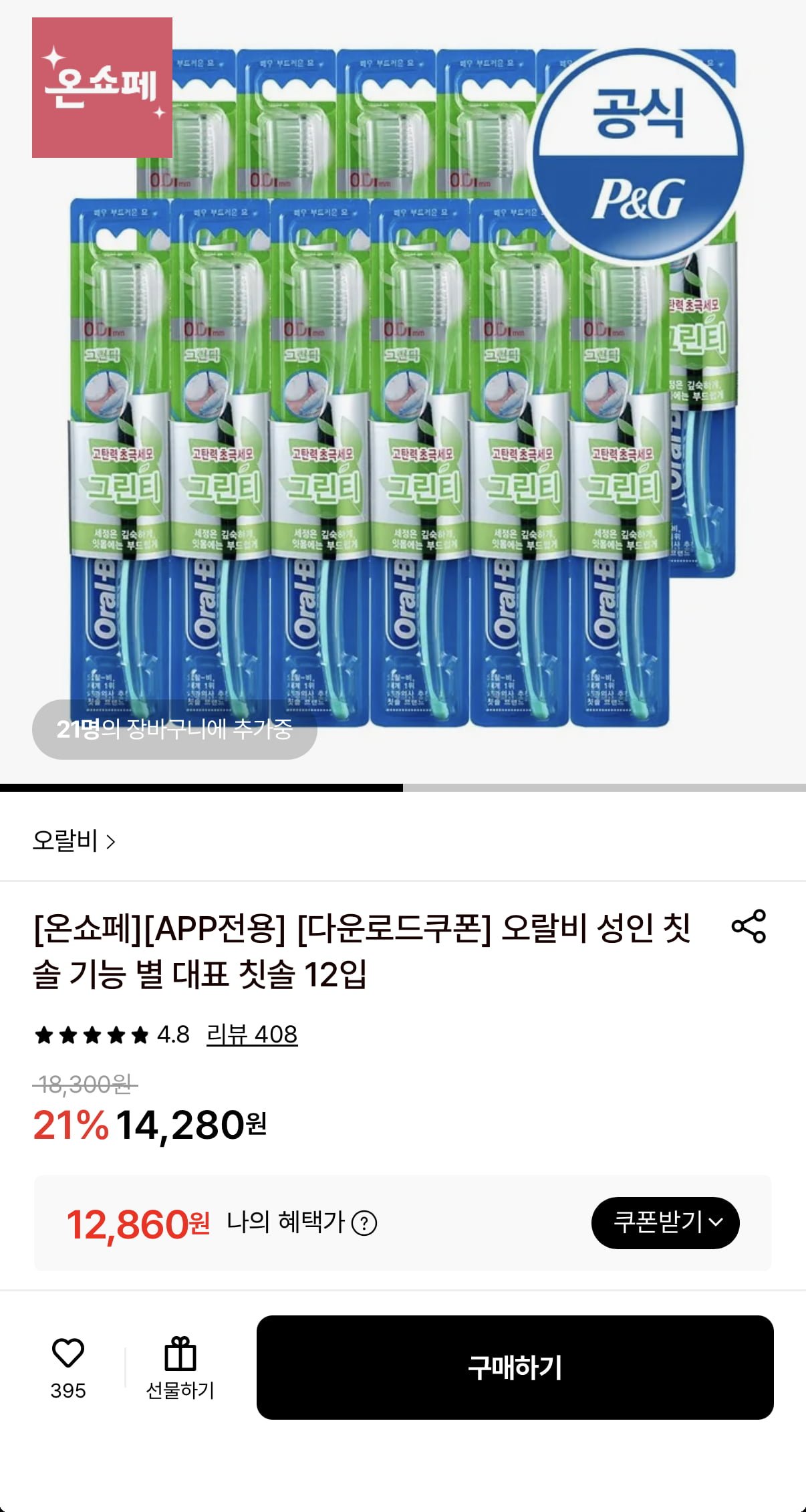 [롯데온]오랄비 초미세모 그린티 칫솔 12입 (12,860원/무료)