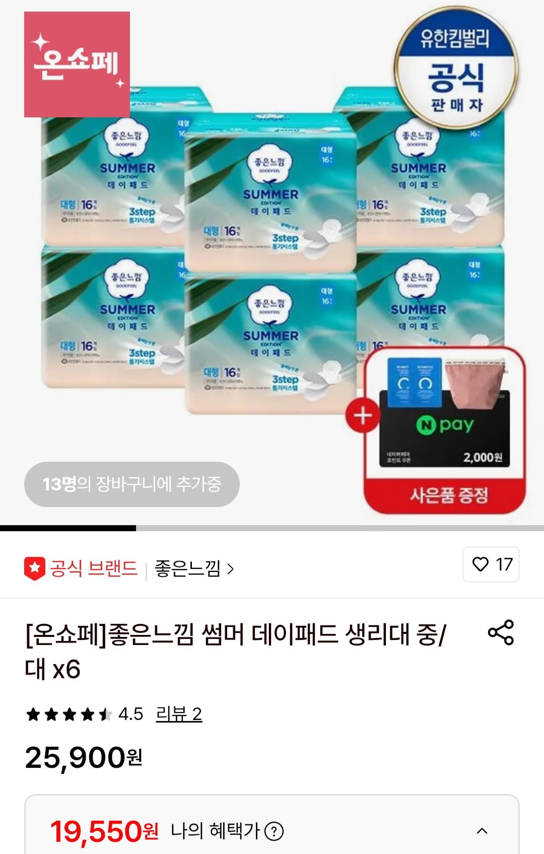 [롯데온]좋은느낌 썸머 생리대 중/대 6팩 (19,550원/무배) - 딜모아