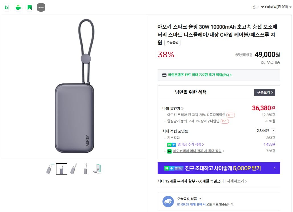 [네이버]아오키 스파크 슬링 30W 10000mAh 초고속 충전 보조배터리 스마트 디스플레이/내장 C타입 케이블/패스쓰루 지원 (36,380원/무배)뽐뿌·-26분 전·36,380원👍 0💬 3전자IT네이버원문 보기 →