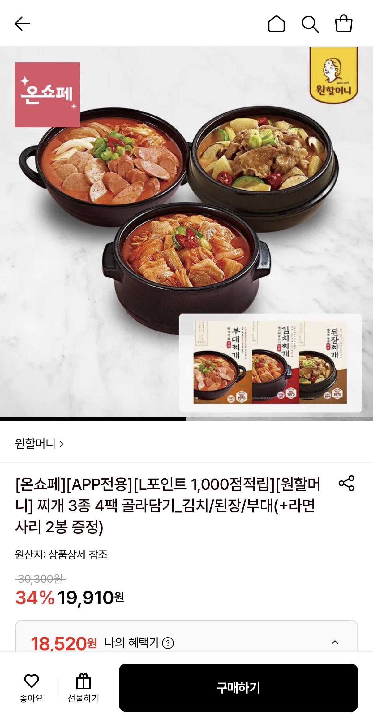 [롯데온]원할머니 찌개 3종 4팩 골라담기 + 라면사리 2봉 증정 (18,520원/무배) - 딜모아
