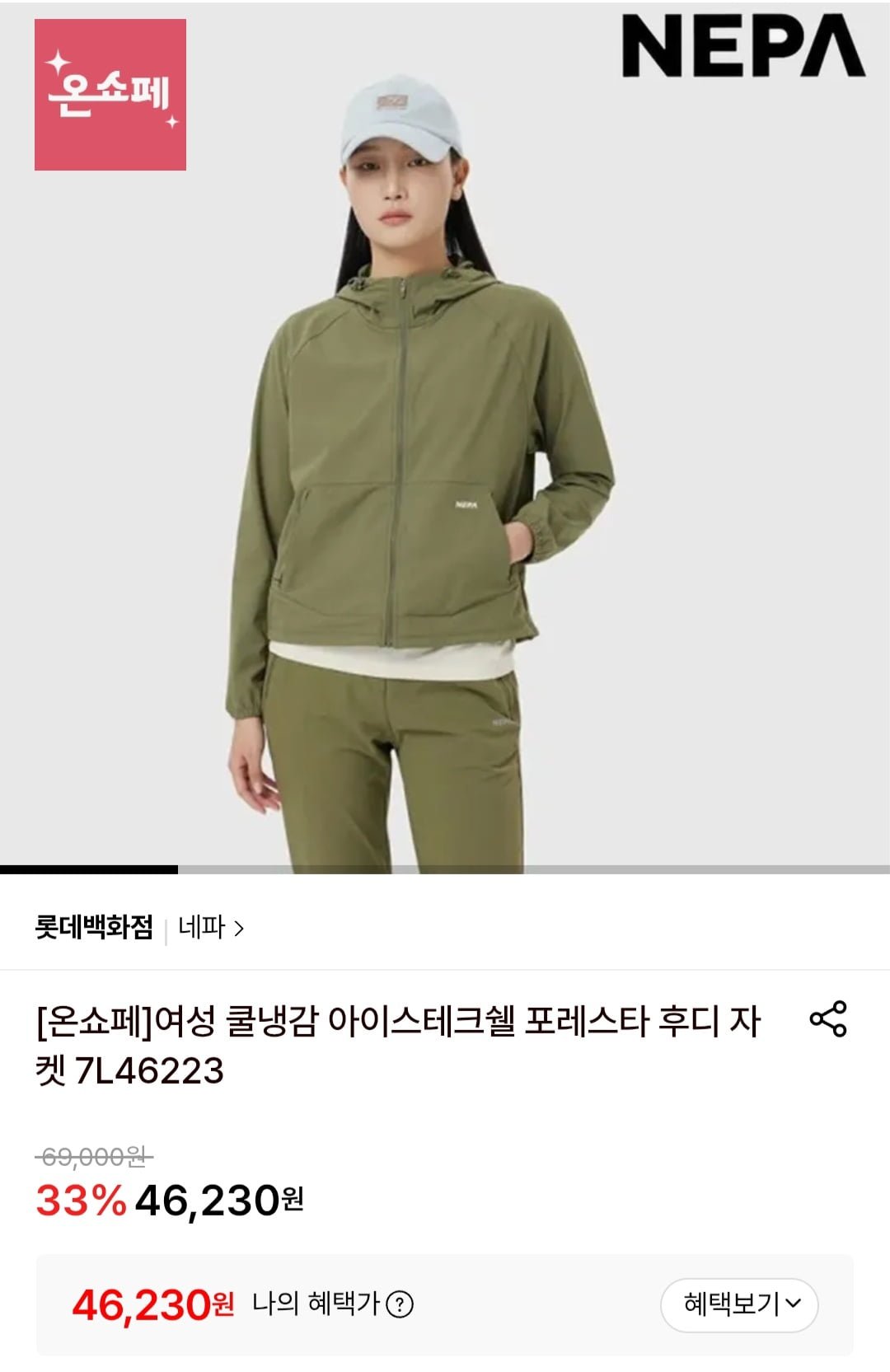 [롯데온]네파 여성 쿨냉감 아이스테크쉘 포레스타 후디 자켓 (46,230원/ 무료배송)