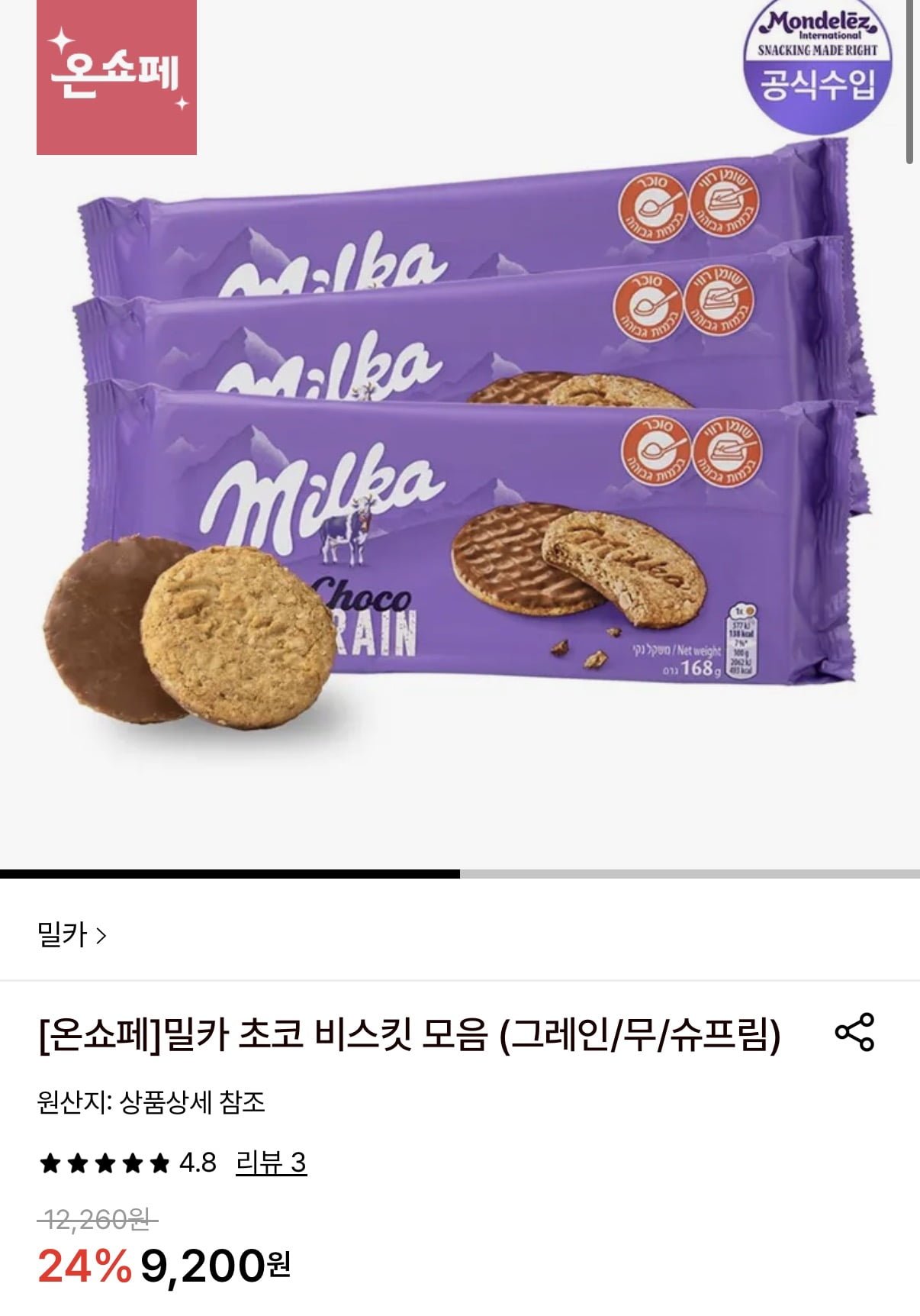[롯데온]밀카 그레인 168g 3개 (9,200원/무료)