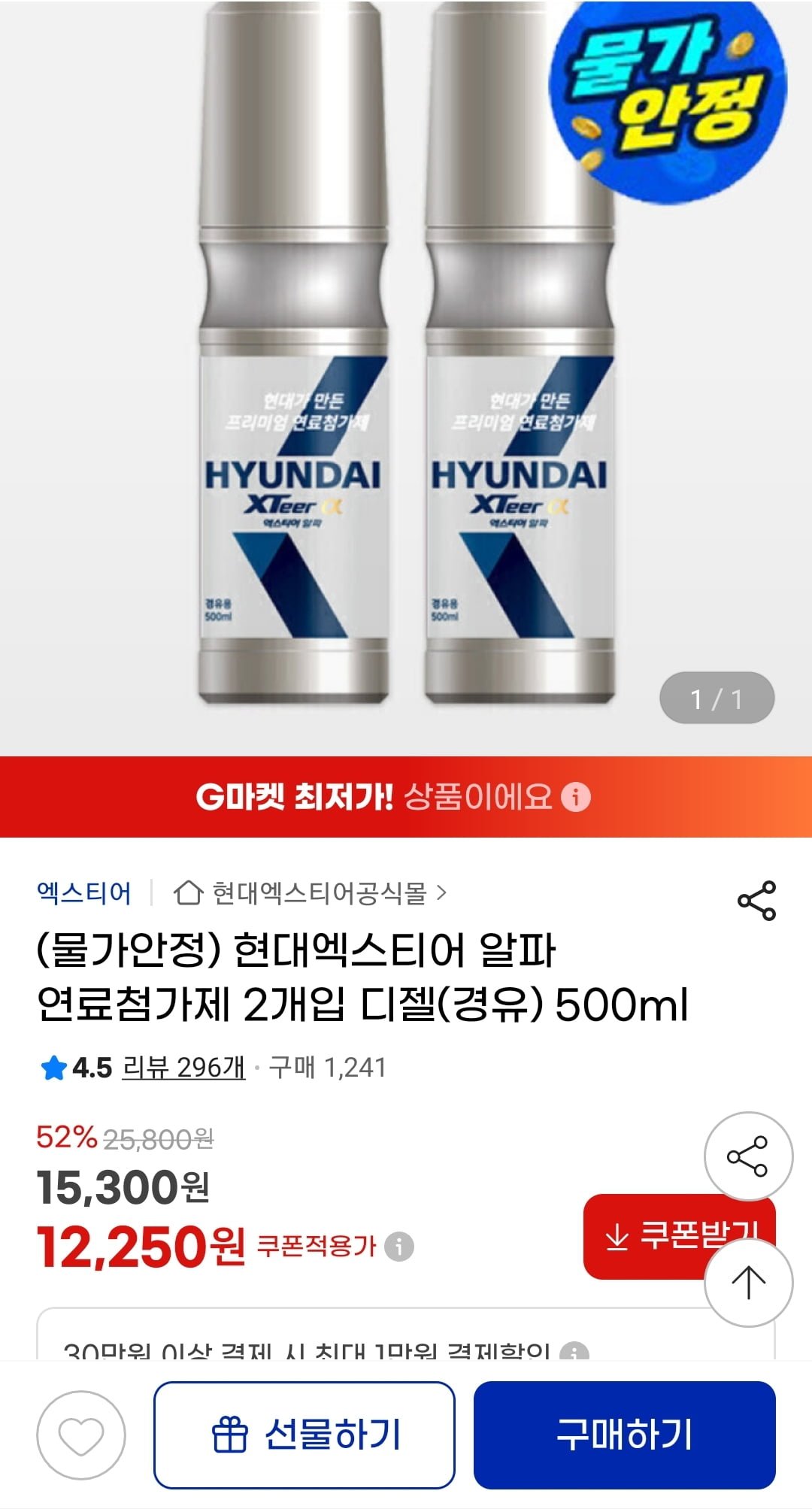[지마켓]현대엑스티어 알파 디젤 연료첨가제 500ml 2개입 (12,250원/무료)