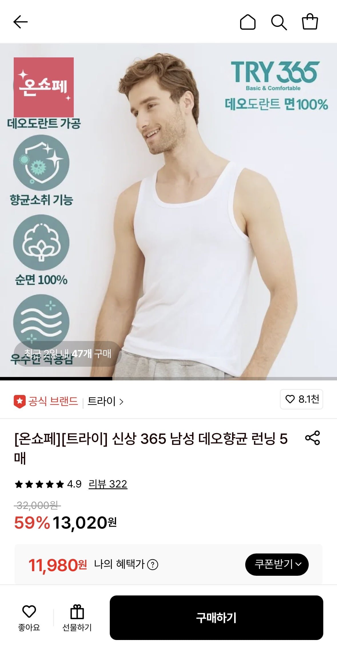 [롯데온]트라이 데오 향균런닝 5매세트 (11,980원/무배)