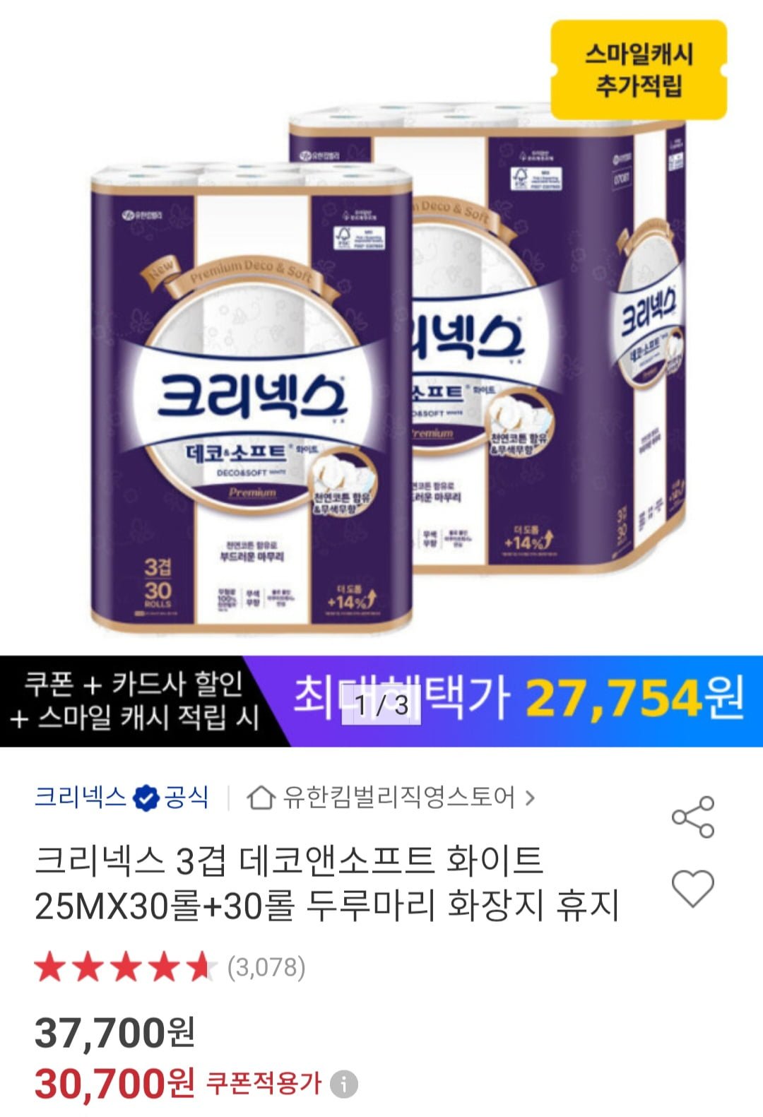 [옥션]크리넥스 3겹 데코앤소프트 화이트 25MX30롤+30롤 (28,550원/무배)