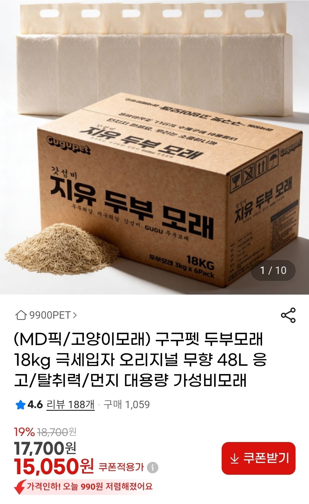 [지마켓]두부모래 18kg 극세입자 오리지널 무향 48L 응고(15,050원/무배) - 딜모아