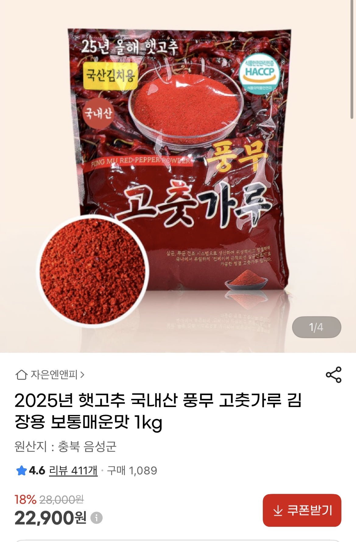 [지마켓]햇고추 국내산 풍무 고춧가루 보통매운맛 1kg(22,900원/무료)