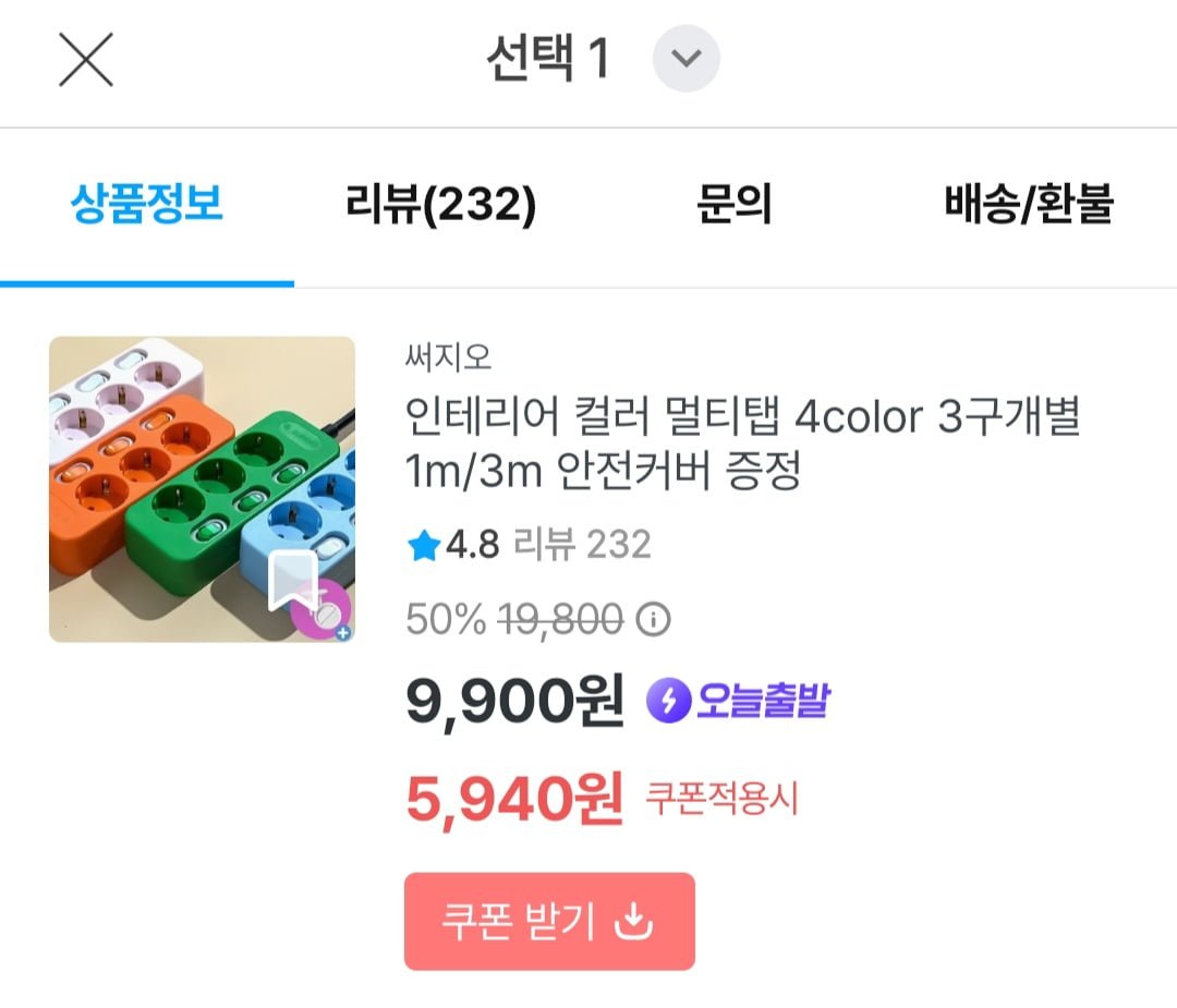 [오늘의집]써지오 인테리어 컬러 멀티탭 4color 3구개별 1m 외 모음 (5,490원/무료)