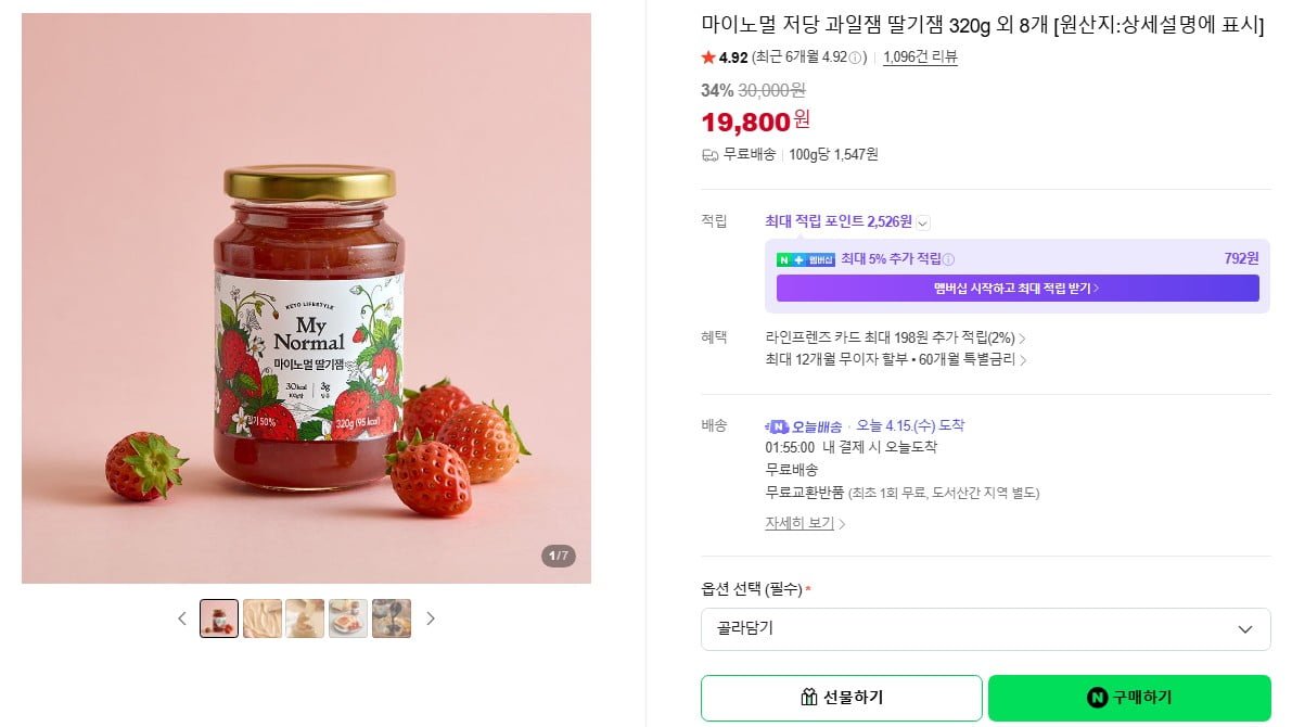 [네이버]마이노멀 저당 잼 320g 2개 8종 골라담기 (15,840원/무료)