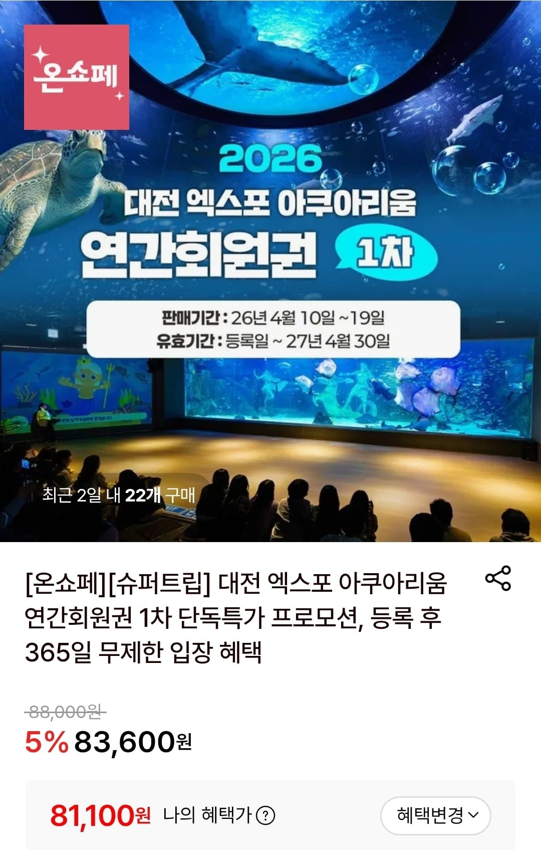 [롯데온]대전 엑스포 아쿠아리움 연간회원권 (국민 81,100원/무료)