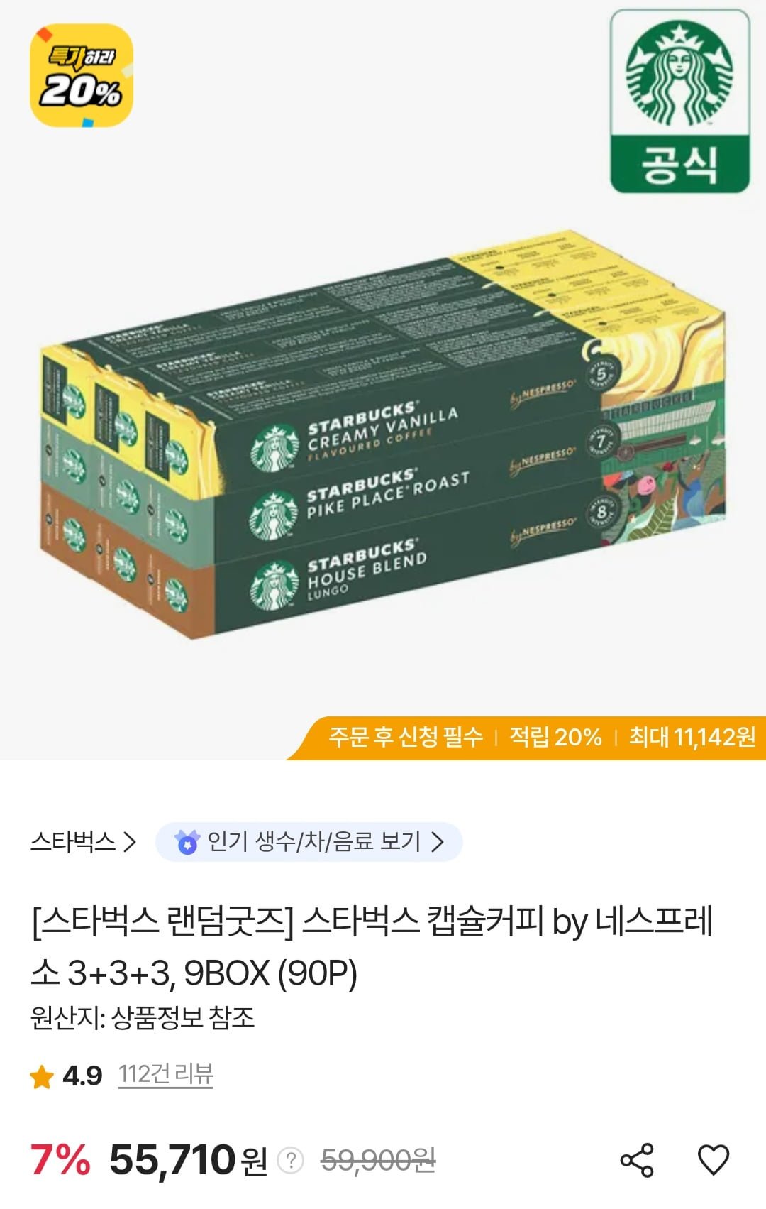 [SK스토아]스타벅스 캡슐커피 by네스프레소 90P (삼성카드 52,925원/무료)
