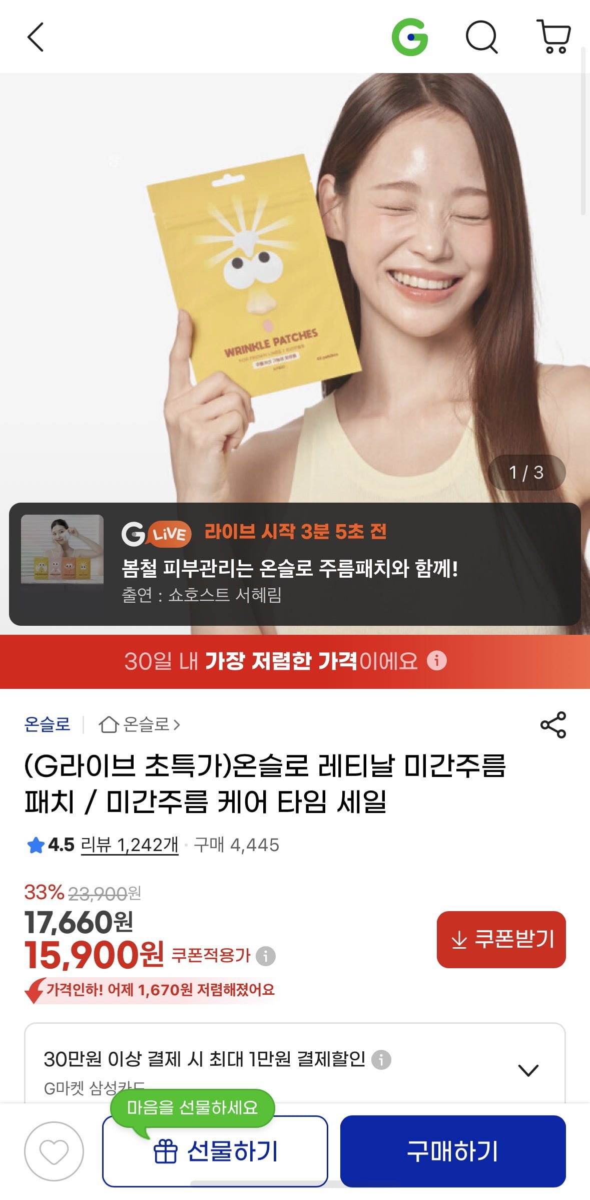 [지마켓]온슬로 레티날 미간주름패치 라이브 초특가 (15,900/무배)
