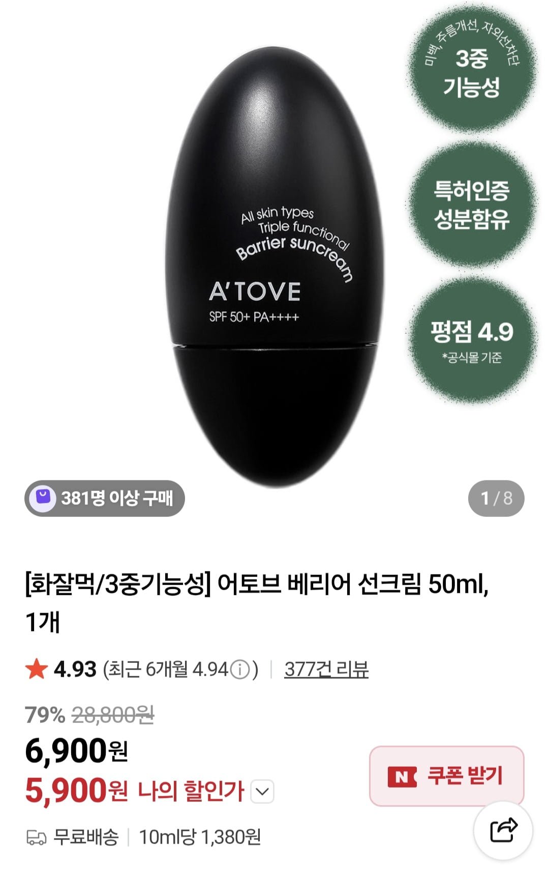[네이버]어토브 베리어 선크림50ml (5,900원/무료)