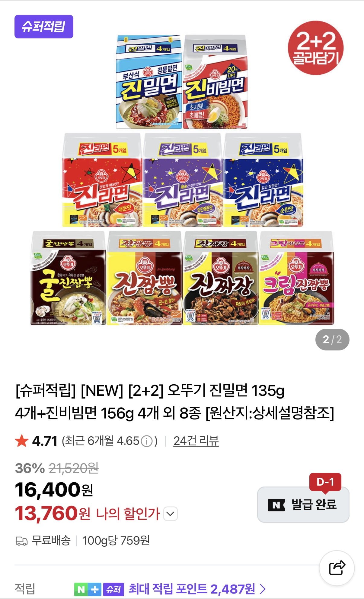 [네이버]오뚜기 진밀면 8개+진비빔면 8개 외 다양 (네멤12,140원/무료)