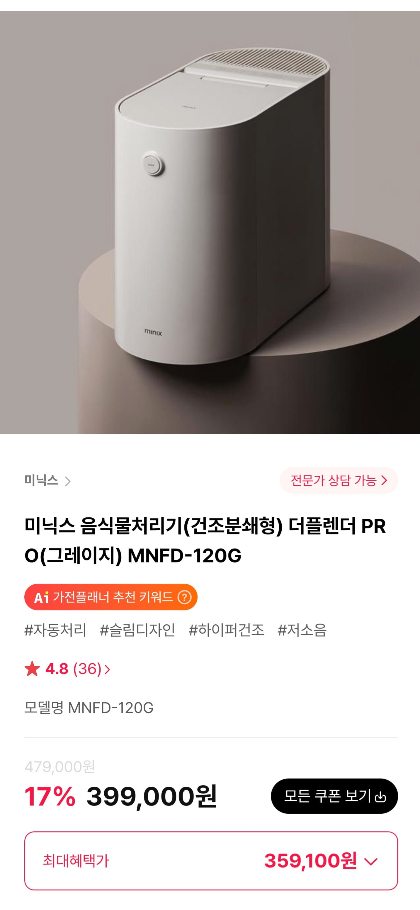 [하이마트몰]미닉스 음식물처리기(건조분쇄형) 더플렌더 PRO (359,100원/무료) - 딜모아