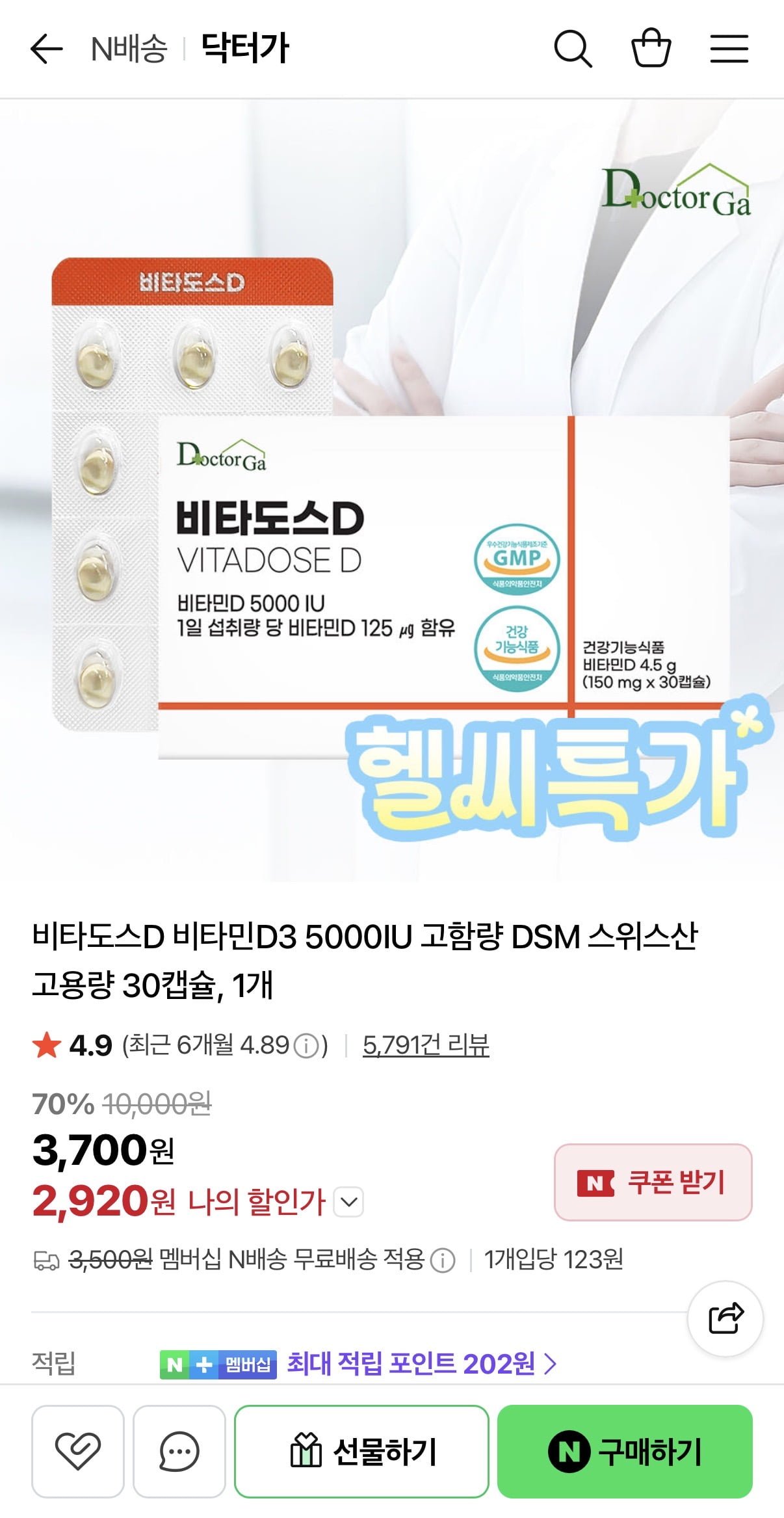 [네이버]비타민D3 5000IU 고함량 30캡슐 (2,920원/네멤무료)