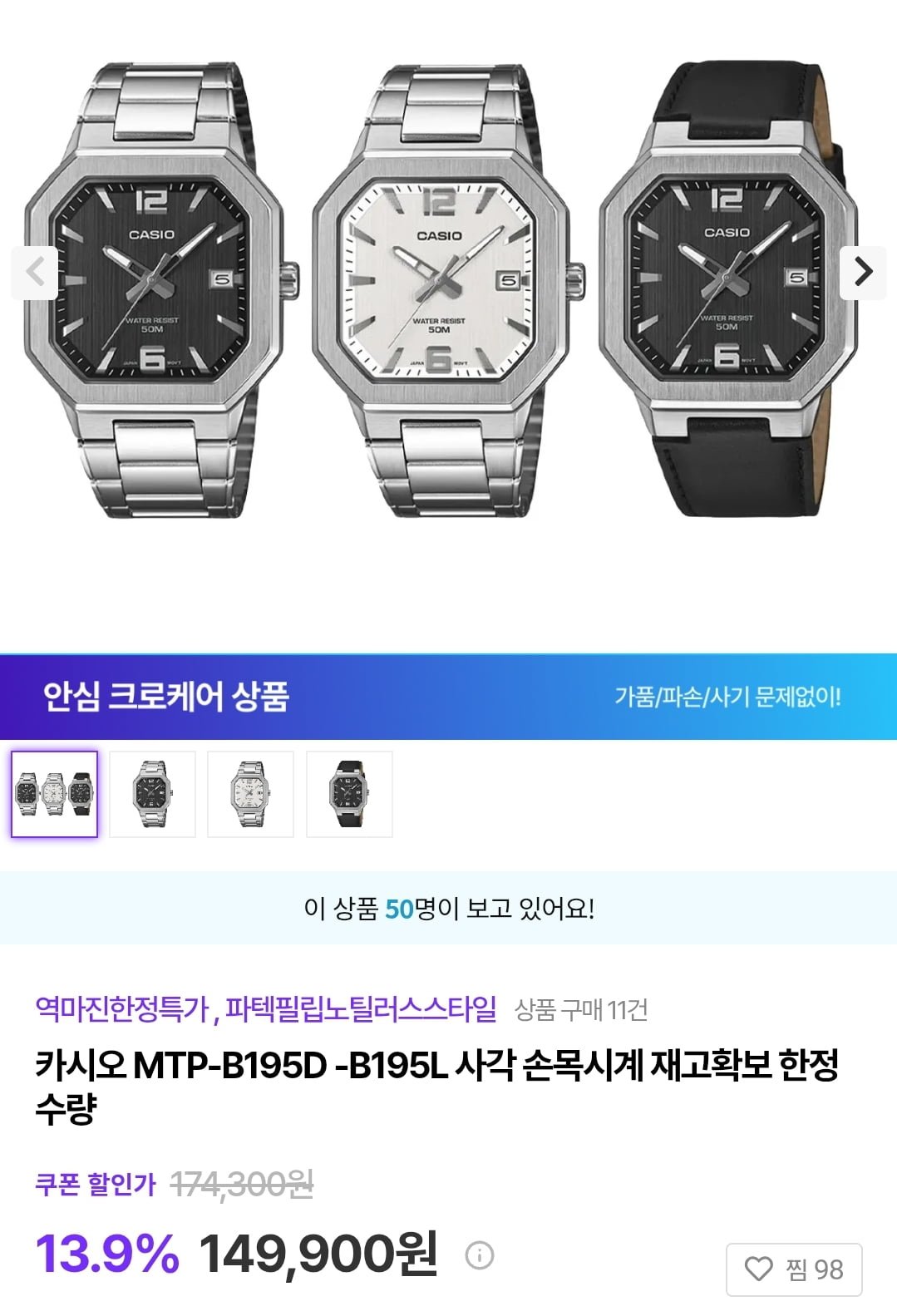 [크로켓]카시오 MTP-B195D -B195L 사각 손목시계 (149,900원/무료)