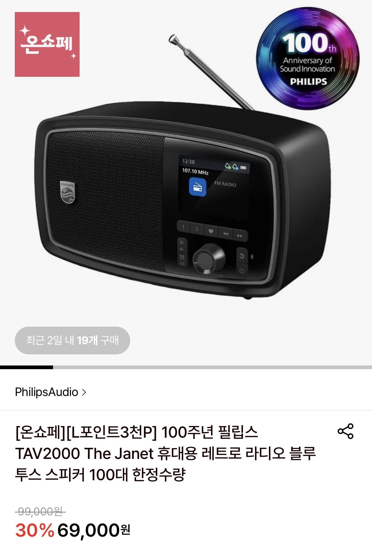 [롯데온]필립스 TAV2000 The Janet 블루투스 휴대용 레트로 라디오 (69,000원/무료)