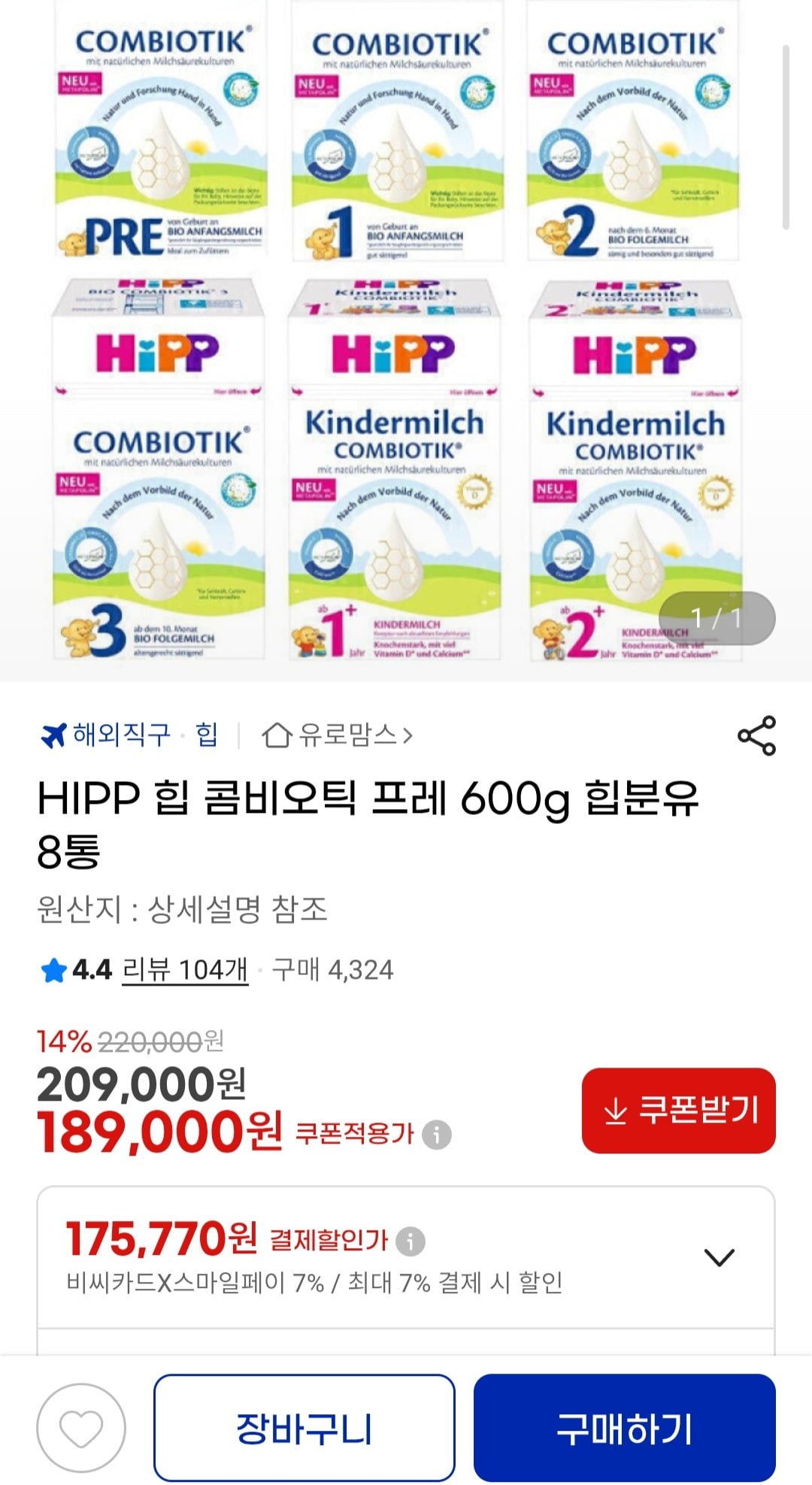 [지마켓]HIPP 힙 분유 콤비오틱 프레 600g 8통 (175,770원/무료) - 딜모아