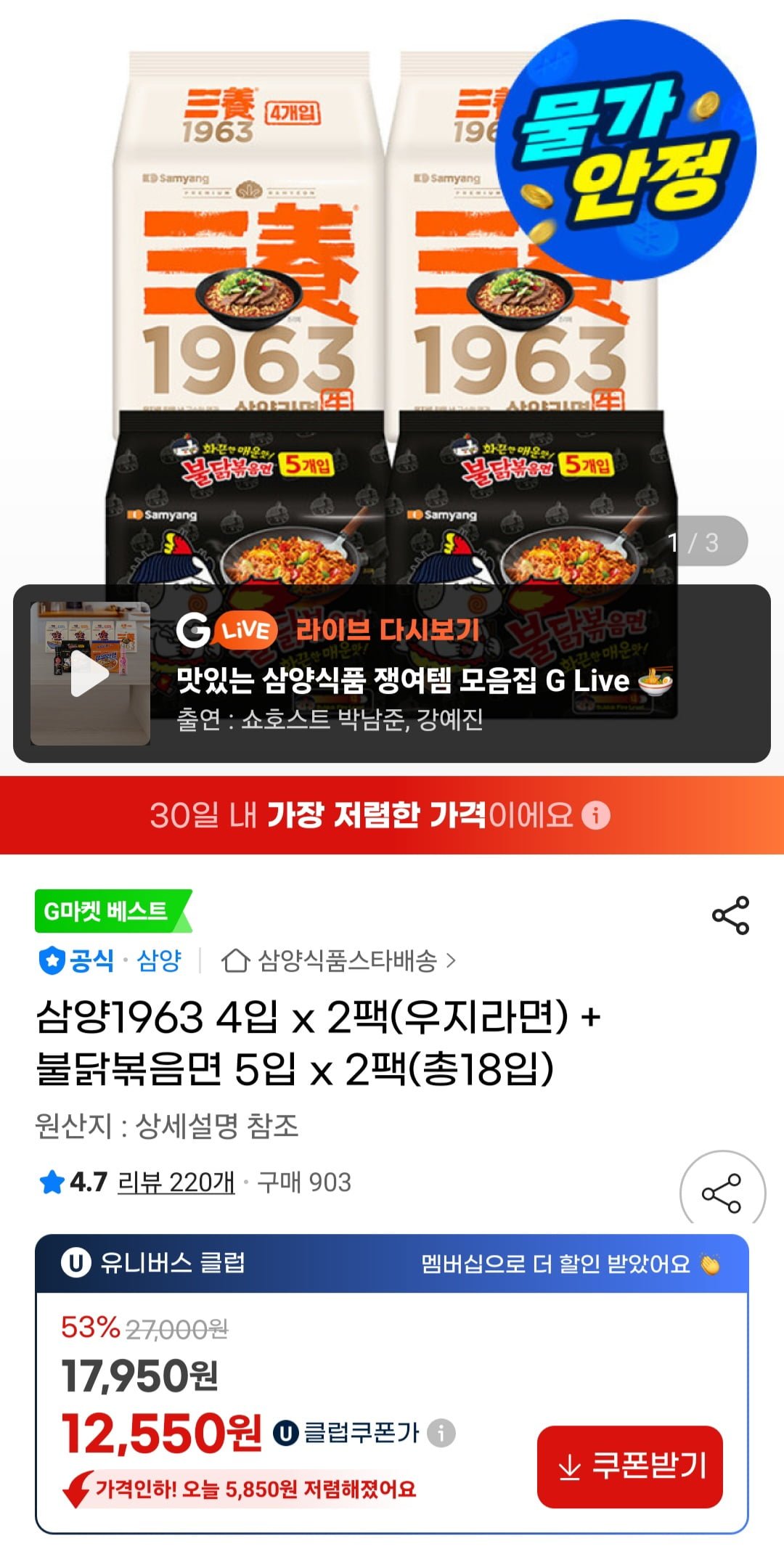 [지마켓]삼양1963 4입 x 2팩(우지라면) + 불닭볶음면 5입 x 2팩(총18입) (유클 12,550원/무료)