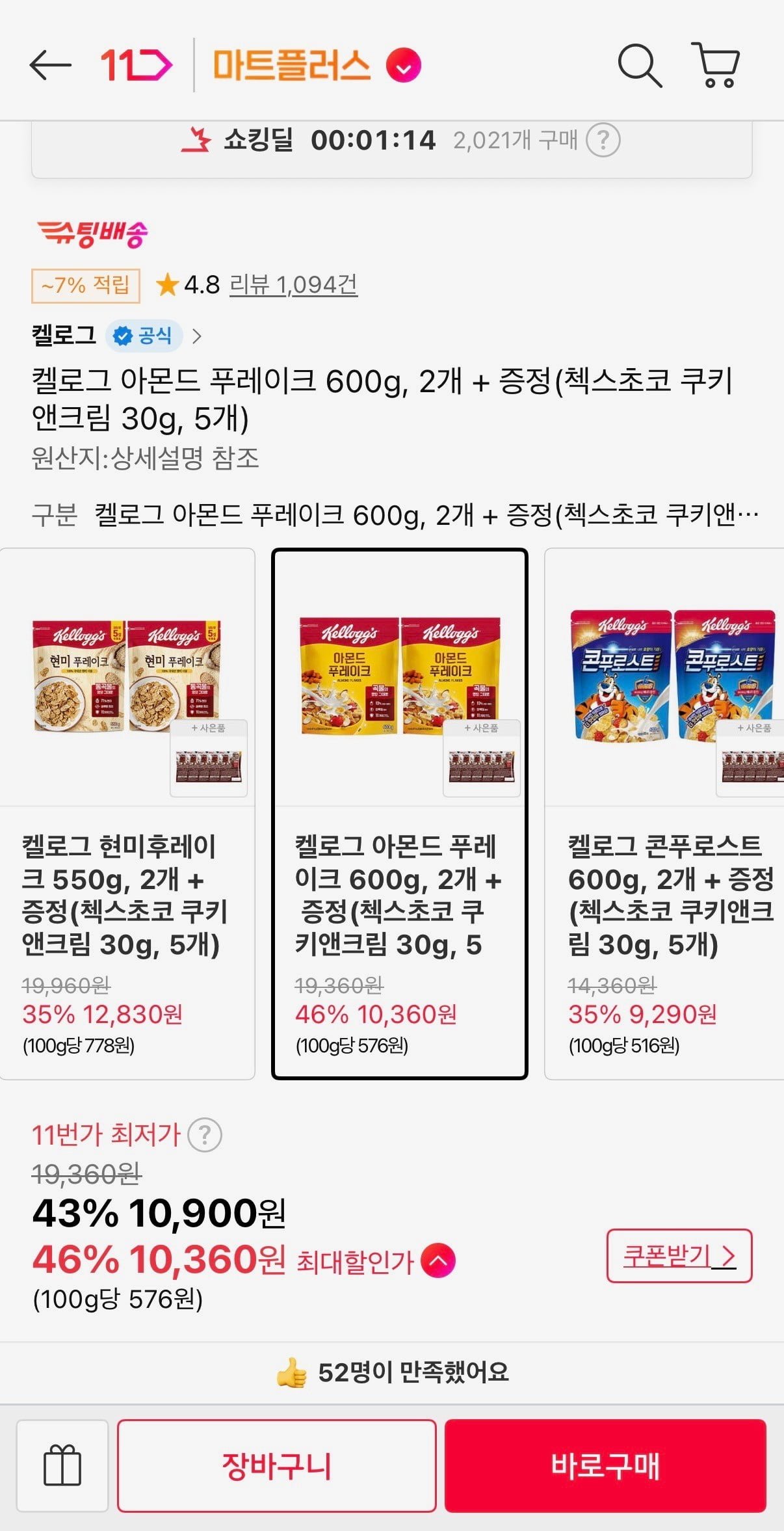 [11번가]켈로그 아몬드 푸레이크 600g, 2개 + 증정(첵스초코 쿠키앤크림 30g, 5개)(10,360원/무료배송)뽐뿌·18시간 전·10,360원👍 0💬 0식품11번가원문 보기 →