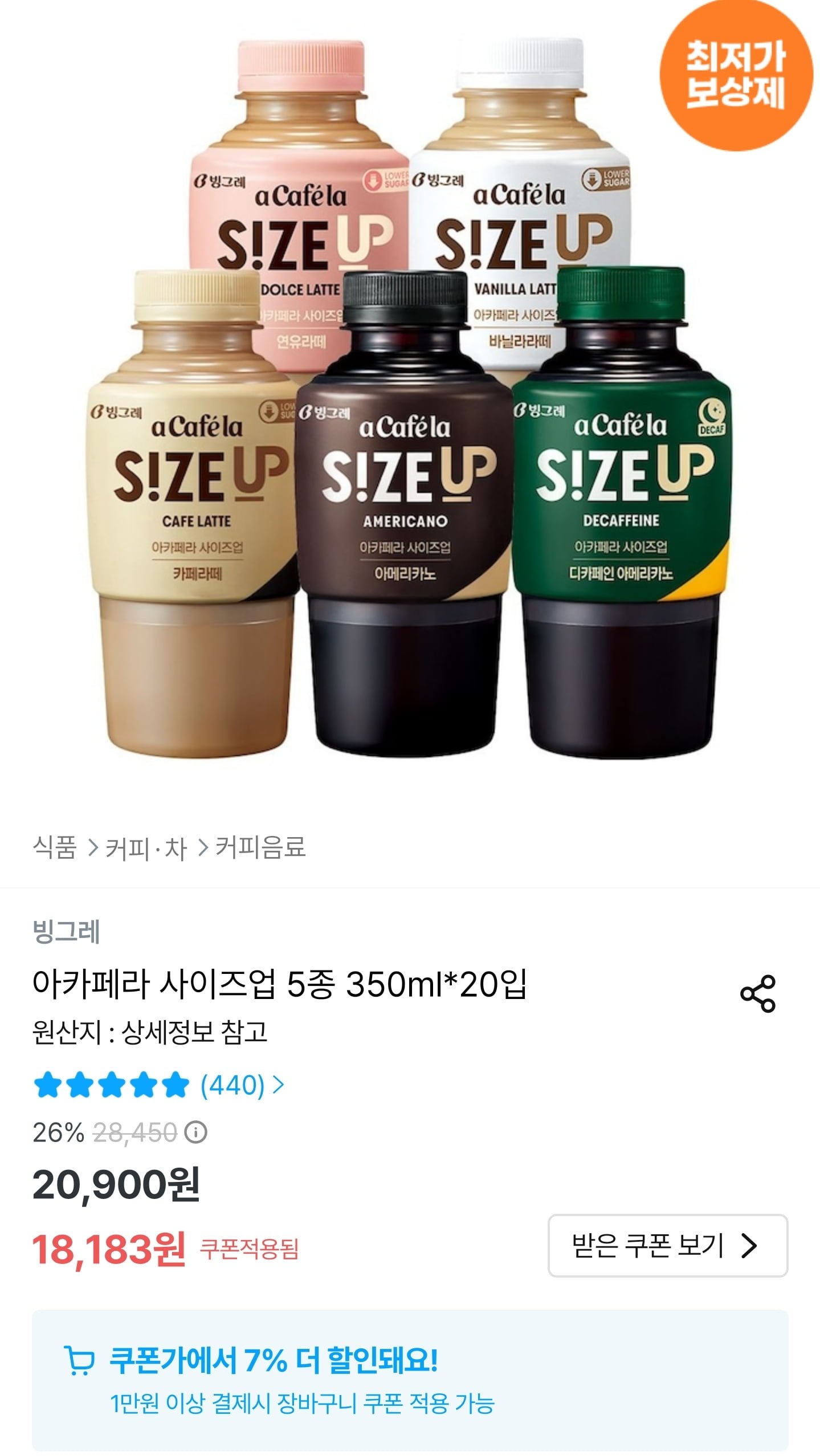 [오늘의집]아카페라 사이즈업 5종 350ml 20입 (16,910원/무료) - 딜모아