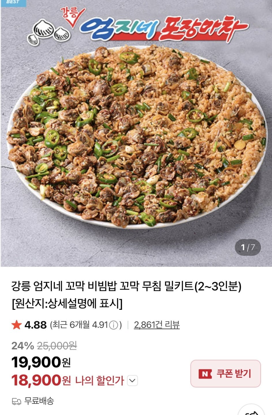 [네이버]강릉 엄지네 꼬막 비빔밥 꼬막 무침 밀키트 2~3인분 (18,900원/무료)
