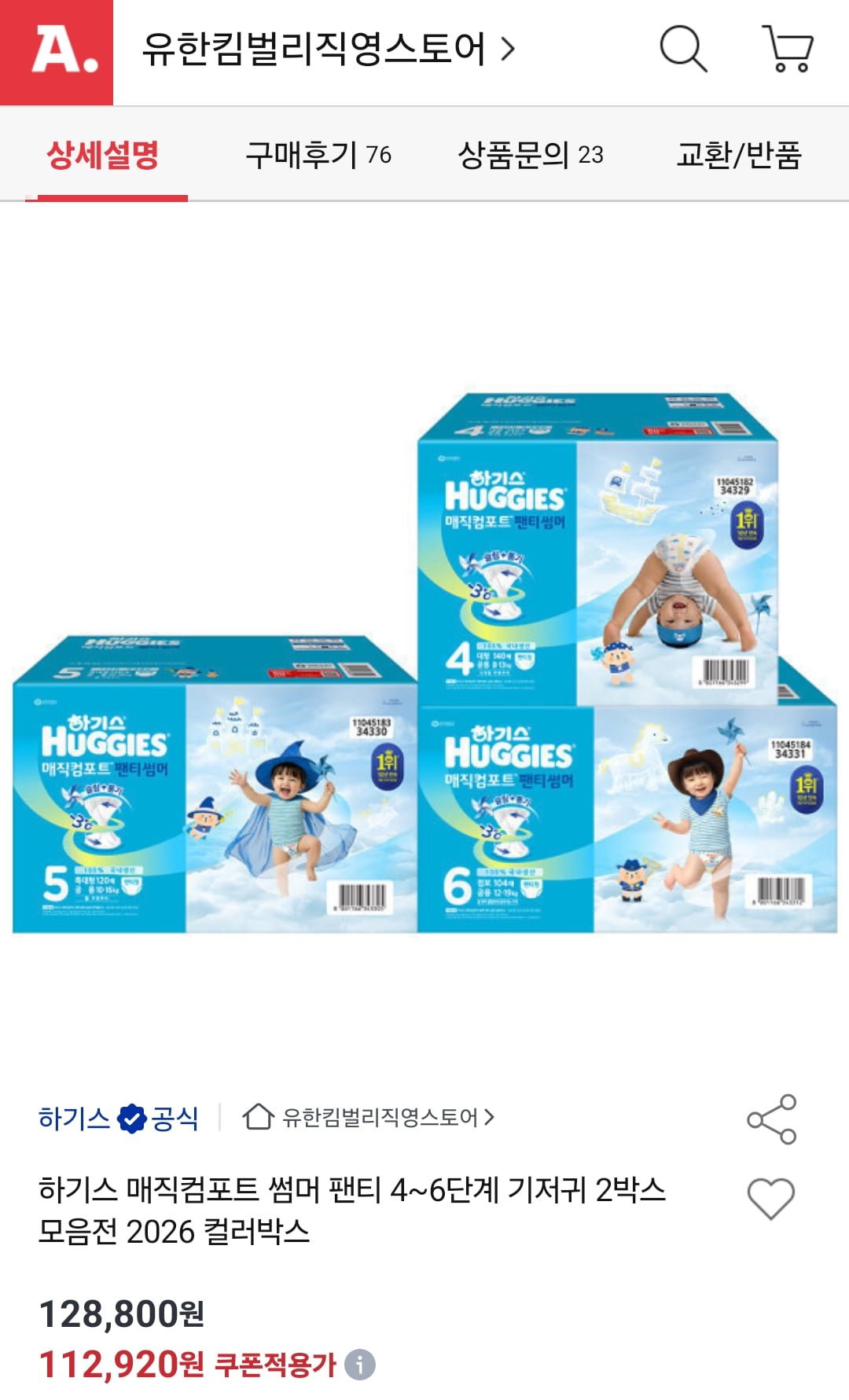 [옥션]하기스 매직컴포트 썸머 팬티 4단계 2박스 112,920원/무배