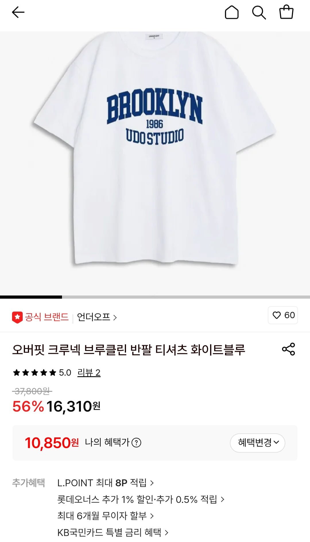 [롯데온]오버핏 크루넥 브루클린 반팔 티셔츠 (10,850원/무료)