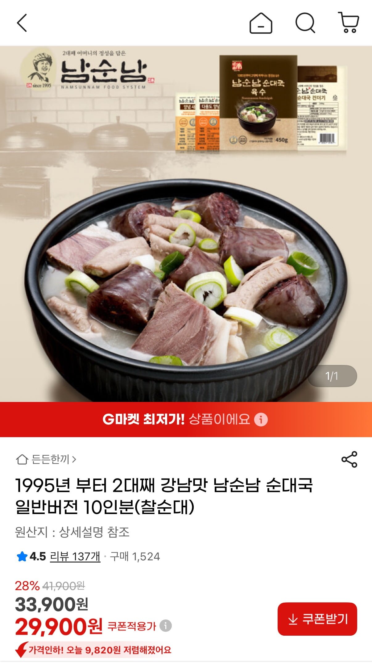 [지마켓]남순남순대국 일반 10인분 (유클 29,900원/무료)