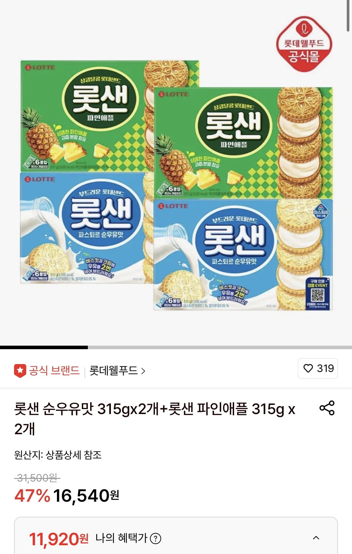 [롯데온]롯데샌드 순우유맛 315g 2개+파인애플맛 315g 2개 (11,920원/무료)