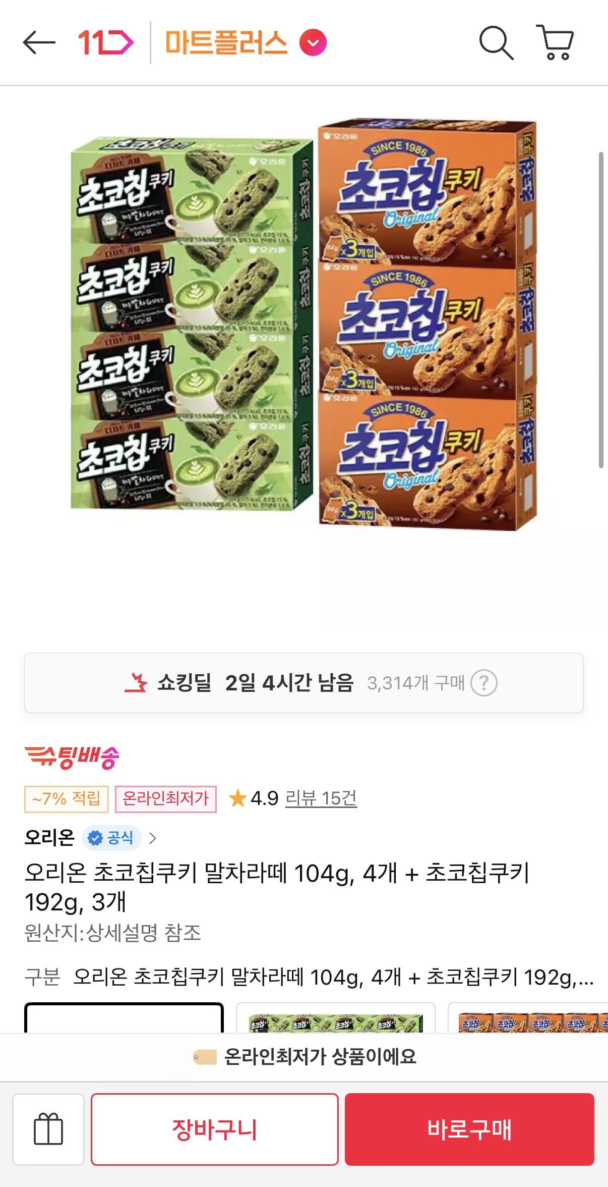 [11번가]오리온 초코칩쿠키 말차라떼 104g, 4개 + 초코칩쿠키 192g, 3개(티멤11,490원/무료) - 딜모아