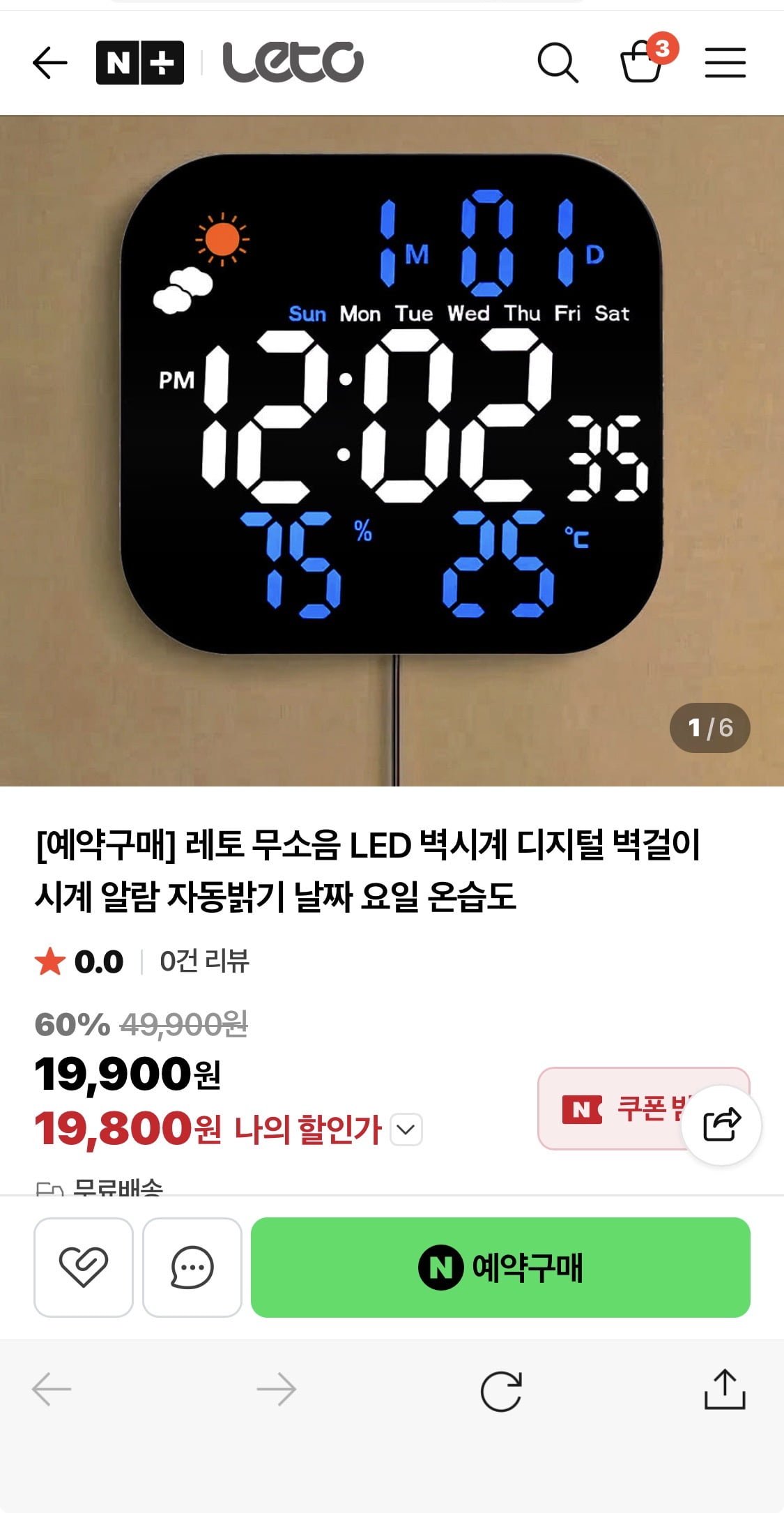 [네이버]무소음 LED 벽시계 예약구매 (19,800원/무료)