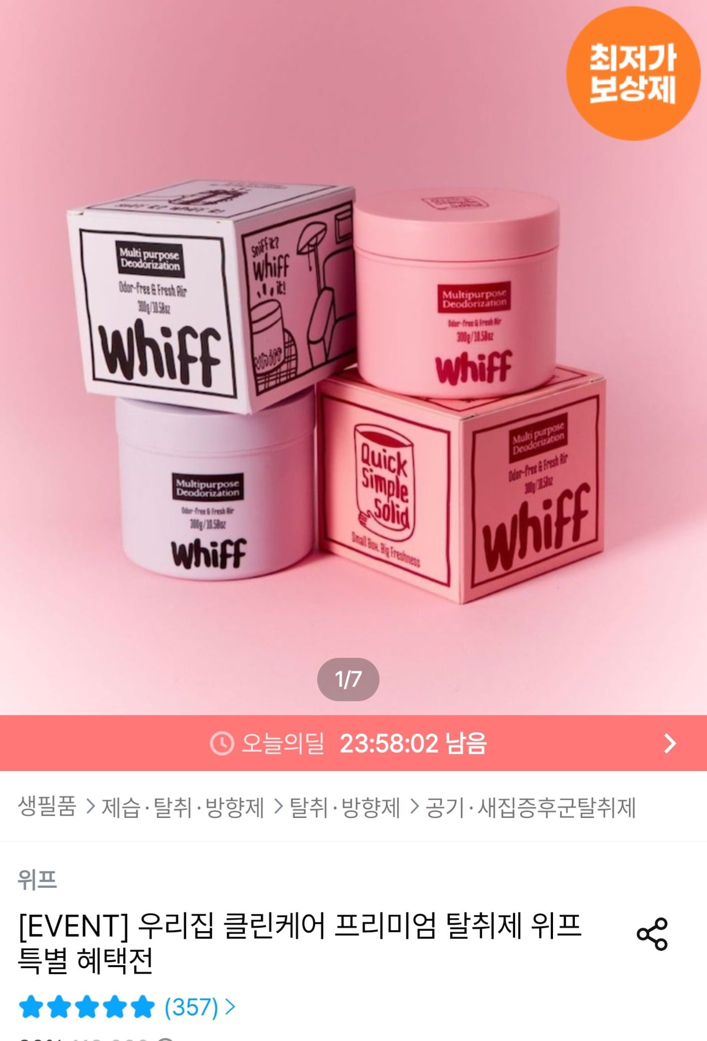 [오늘의집]위프 생활 탈취제 300g 2개 + 섬유탈취제 50ml 1개 증정 (29,900원 / 무배) - 딜모아