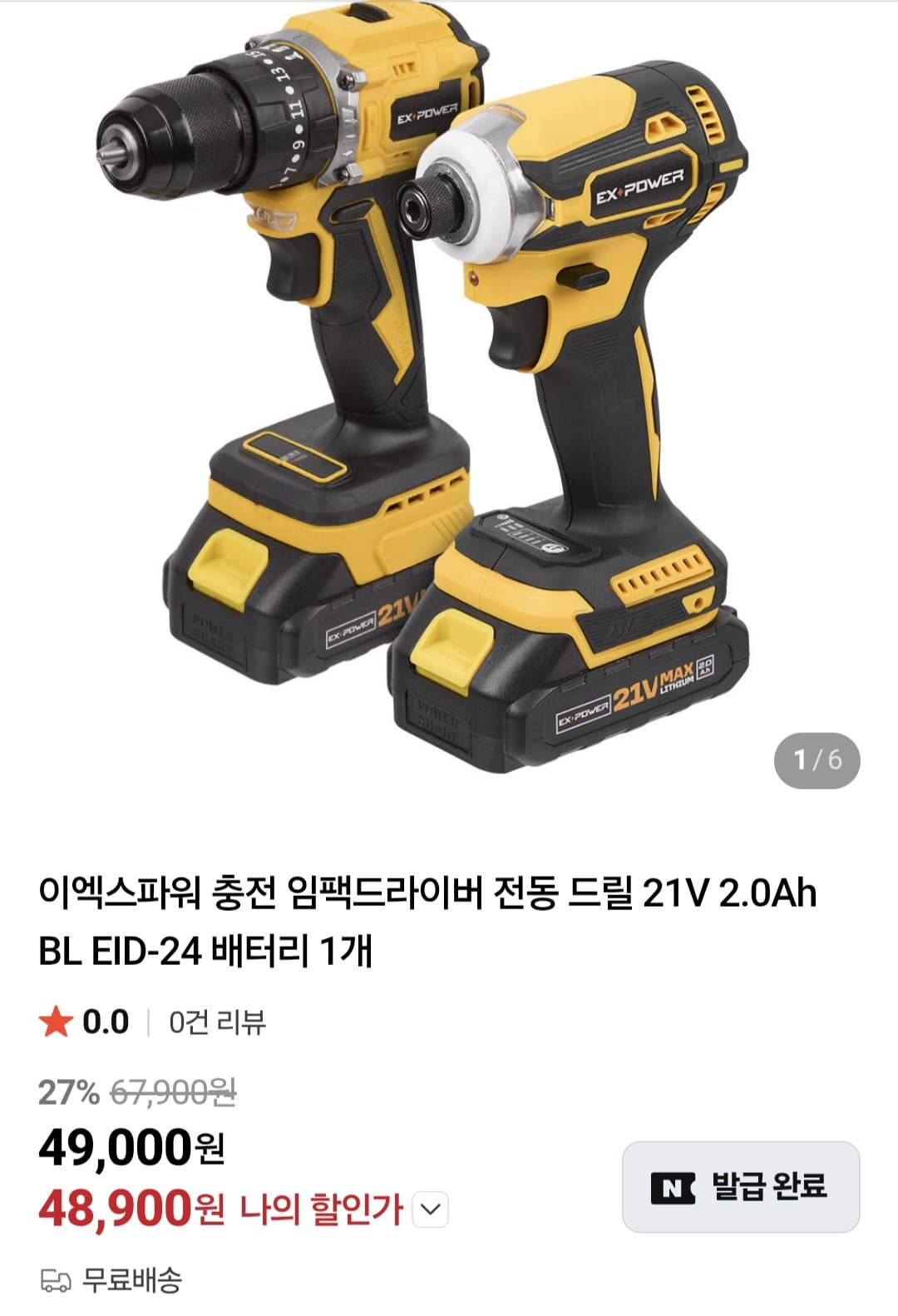 [네이버]이엑스파워 충전 임팩드라이버 전동 드릴 21V 2.0Ah BL EID-24 (49,000원/무료)