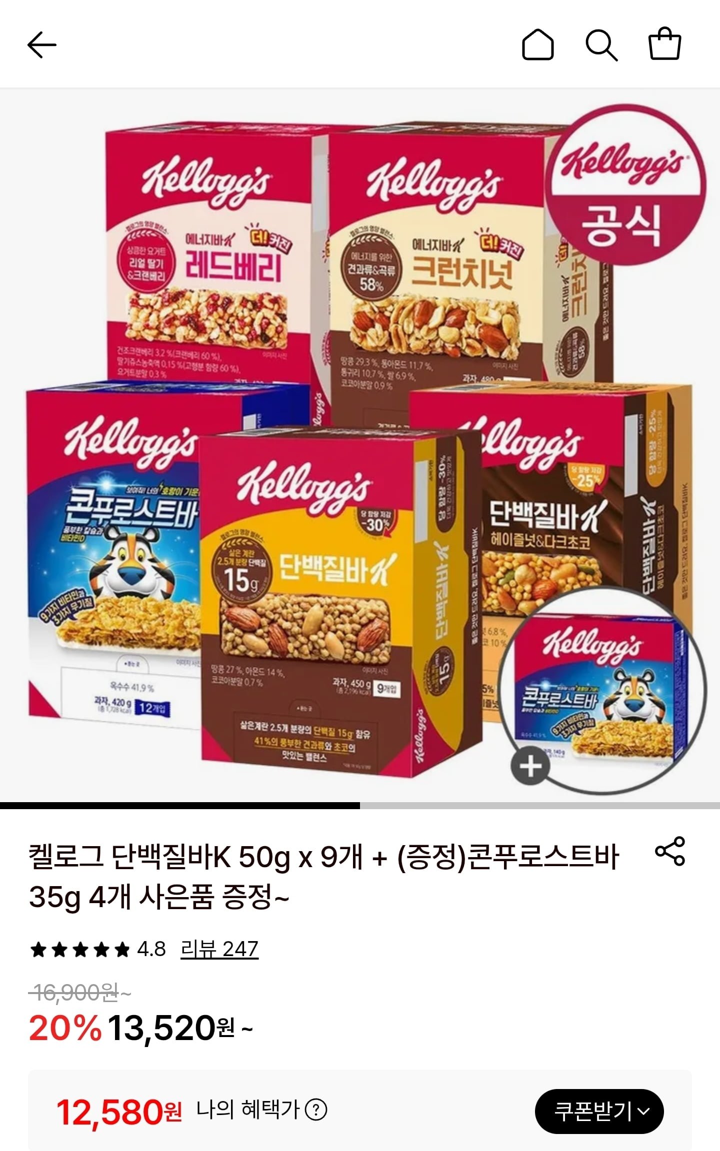 [롯데온]켈로그 단백질바K 50g x 9개 + (증정)콘푸로스트바 35g 4개 (12,580원/무료)
