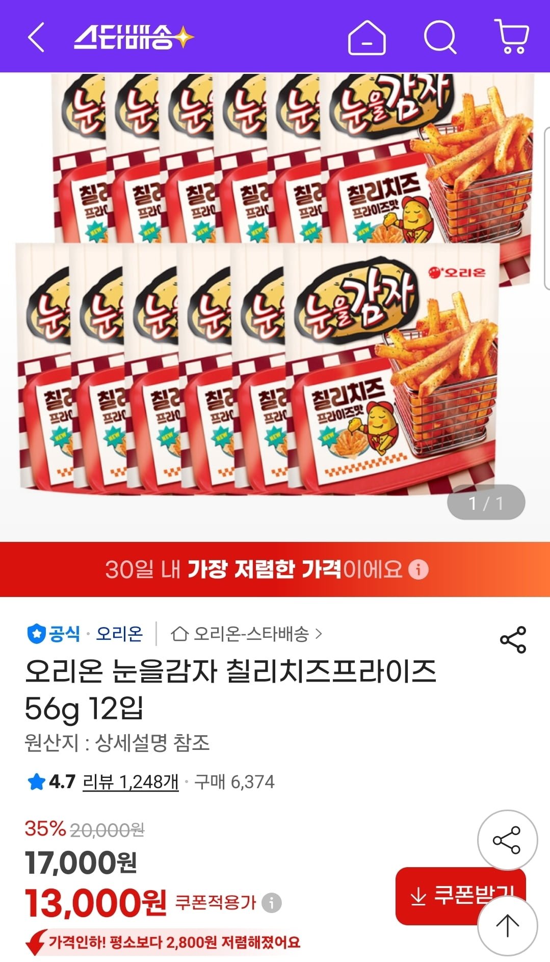 [지마켓]오리온 눈을감자 칠리치즈프라이즈 56g 12입(13,000원/유클무료) - 딜모아