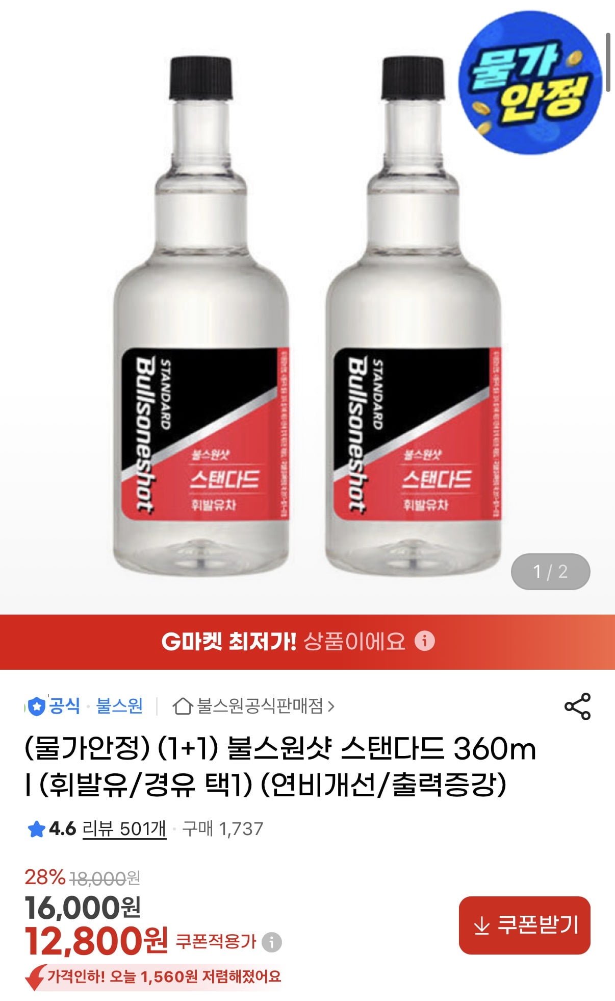 [지마켓]불스원 스탠다드 360ml 1+1(12,800원/무배) - 딜모아